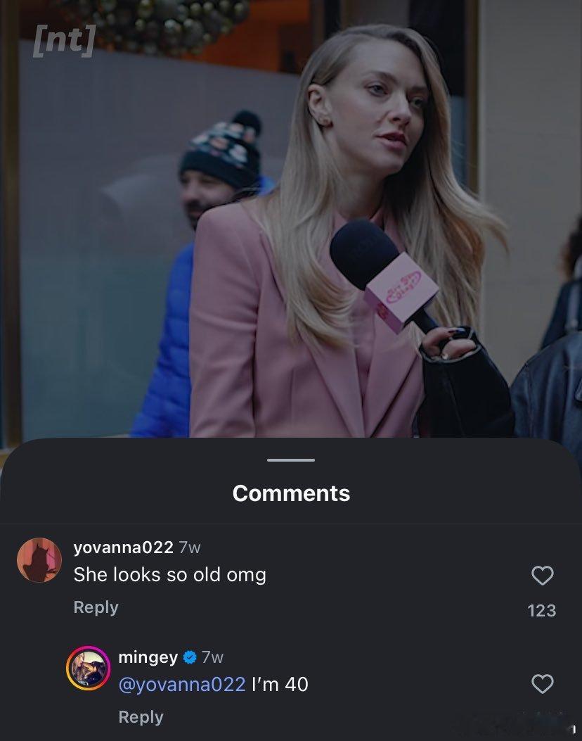 当有人评论Amanda Seyfried阿曼达塞弗莱德看起来老了不少时阿曼达回应“我40岁了(还想怎么样)”😆😆😆好真实的阿曼达!