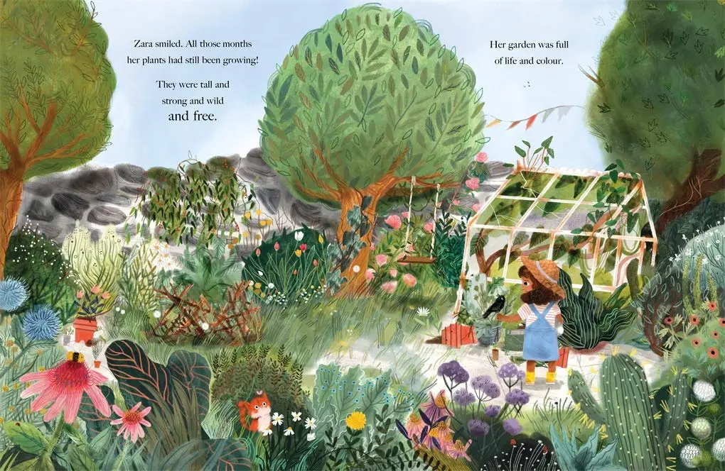 在这个国家有一个城市,在这城市中有个小花园。这个城市因战争而失色,花园却保有一些明亮美丽。小女孩 Zara,即使在战事中仍不畏危险地照顾花园。这里有梨子树、花、各式药草、无花果、杏子和各种蔬菜,提供给城市人们自给自足。有一天,平常会造访花园的孩子们被禁止进入花园了,因为战况愈来愈激烈,炸弹每天飞,城市没有一处安全。大家打包行李准备要离开了,一直守着花园的Zara也是─现在的花园种子散落四处。最后战争结束,Zara返回残破的家,打开久违的花园的门,现在变怎样了?Zara露出一抹微笑,太好了!树在战争期间持续长高、长壮、自由自在,种子发芽、开花,花园保有往日的颜色和活力,带来希望。
