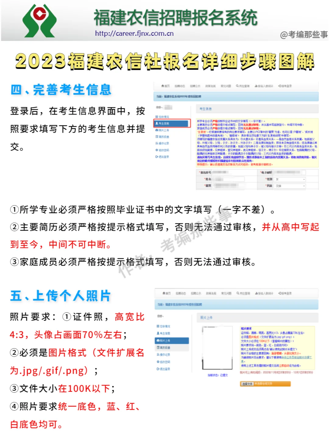 照片要求:①证件照,高宽比4:3,头像占画面70%左右;②必须是图片格式(文件扩展名为.jpg/.gif/.png);③文件大小必须在100K以下(查看照片的属性);④照片要求统一底色,蓝、红、白底色均可。