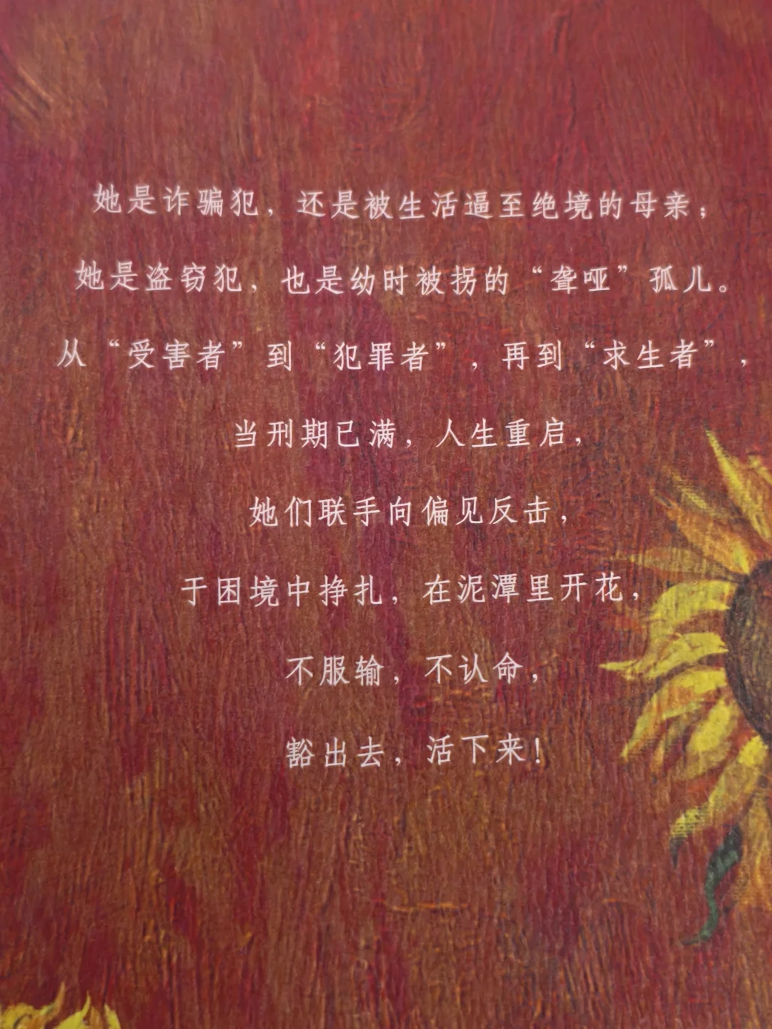 这是我在读完《向阳花》后最深的感慨。翻开书页,扑面而来的不是虚构的矫情,而是带着铁锈味的真实。那些被社会抛弃的女人,在监狱与街巷的夹缝中,用血肉之躯撞开生路的故事。她们不是大女主,没有金手指,甚至活得狼狈不堪,但正是这种狼狈,照见了千万女性生存困境的缩影。