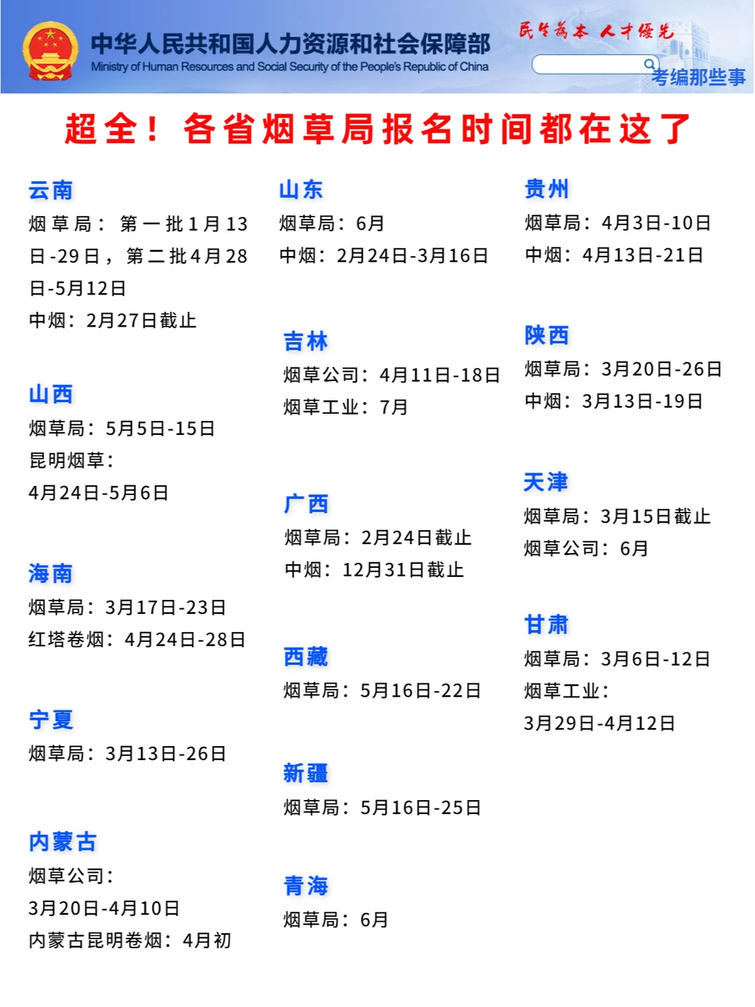 🔹烟草局:第.一批12月9日-31日,第二批管理岗4月3日-12日