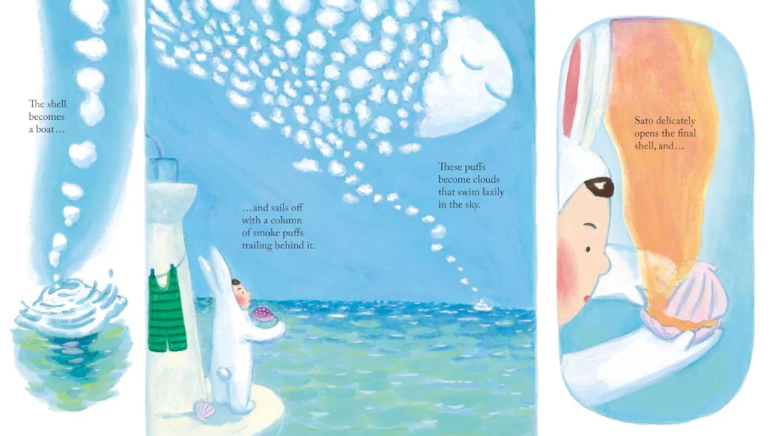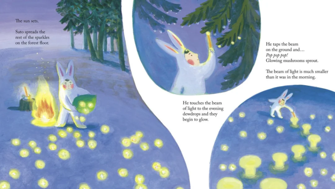 每天早上,兔子佐藤都会睁开眼睛,看着柔和的阳光,准备拥抱宇宙为他准备的一切。有一天,从窗帘里透出的明亮的晨光变成了一个酒吧,把他带到了一片森林,在那里,他把斑驳的阳光聚集成温暖的火,让夜露闪闪发光。另一天,佐藤醒来时发现他的房间变成了漂浮在广阔大海上的灯塔,在那里,他舀起穿过五颜六色的玻璃窗的光线,发出一种特殊的信号,迎接携带美味佳肴的鱼类和海鸟。