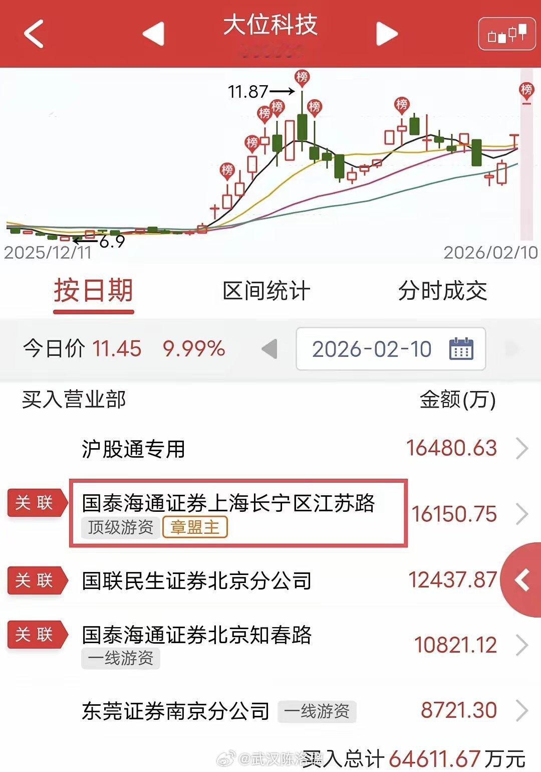 章盟主爆买1.6亿:今天大位科技一字涨停。盘后龙虎榜显示,章盟主三日爆买1.6亿