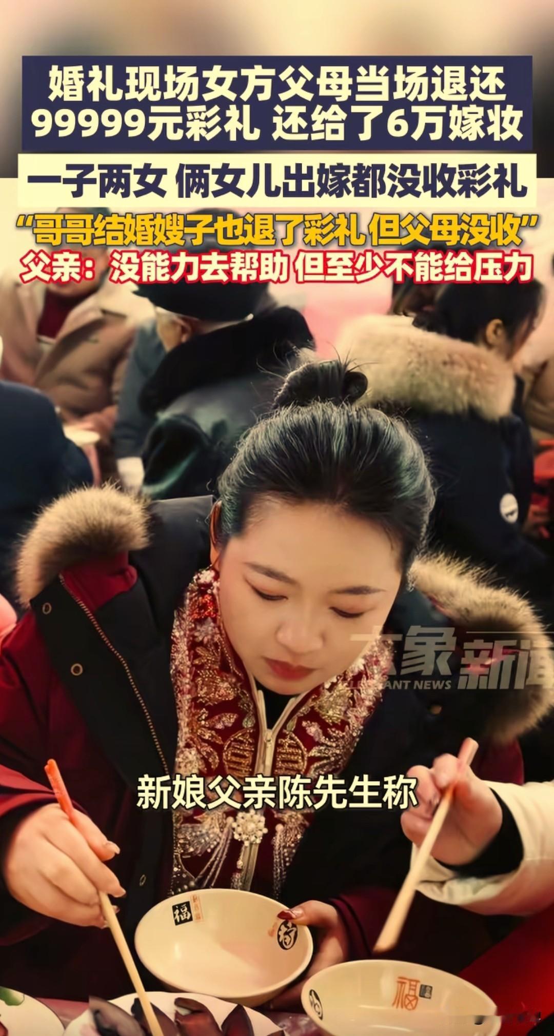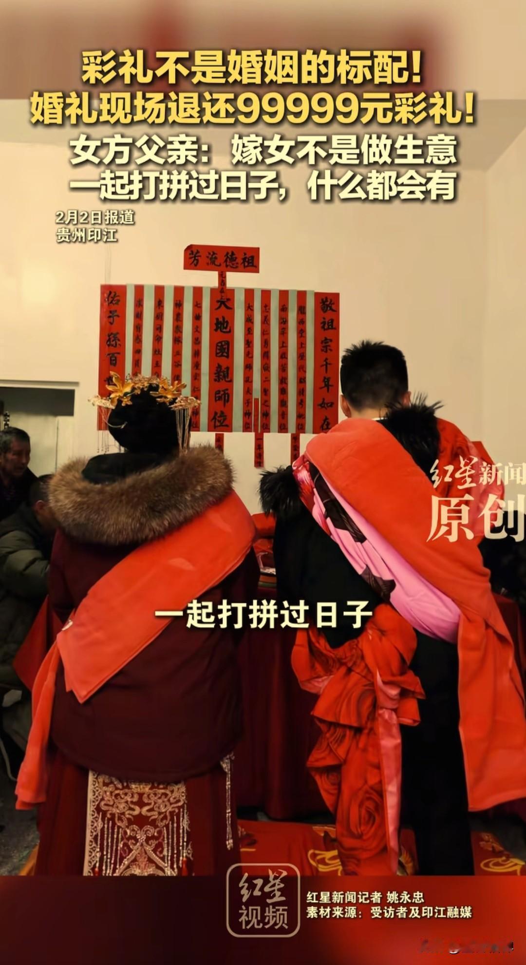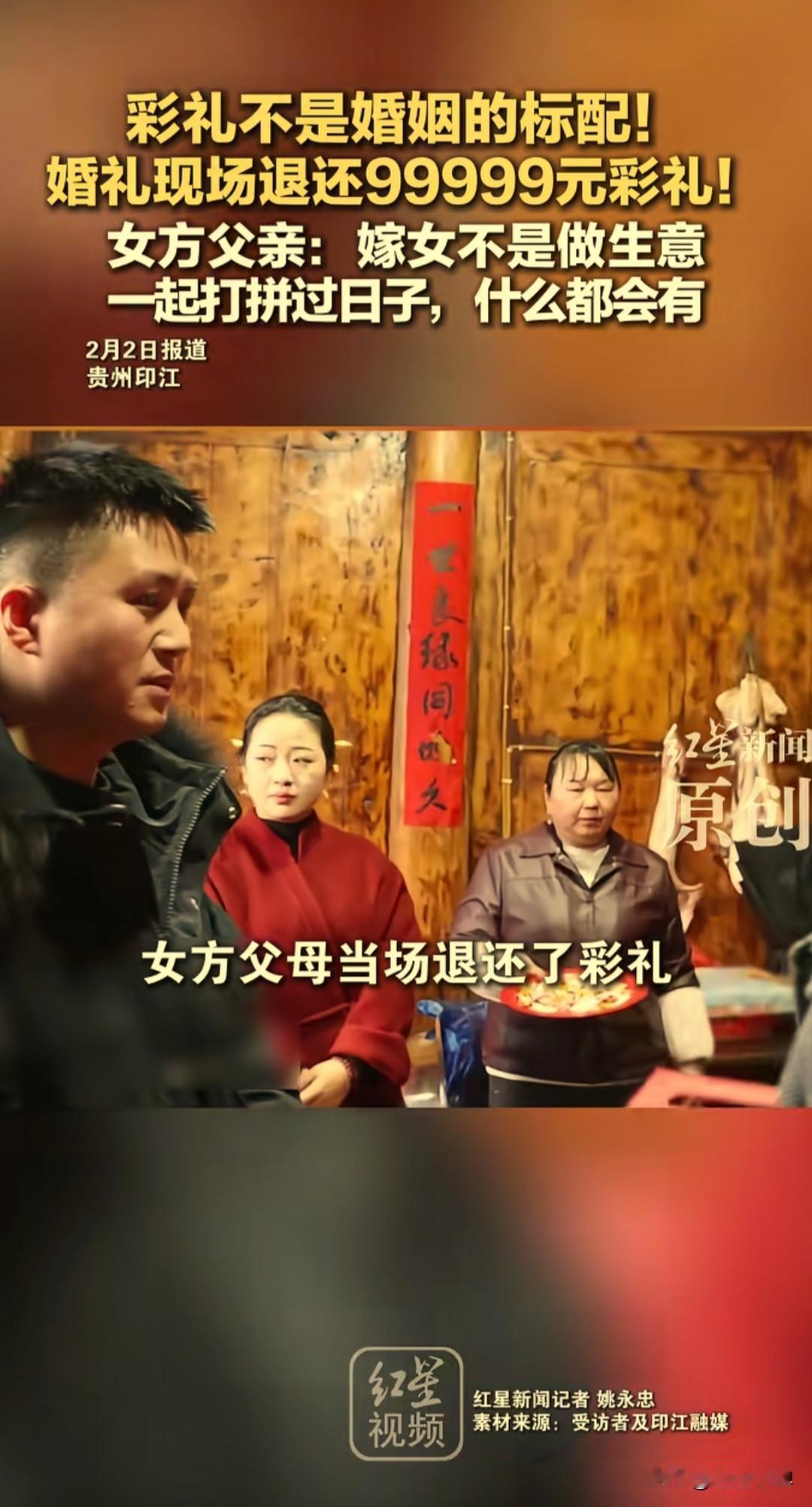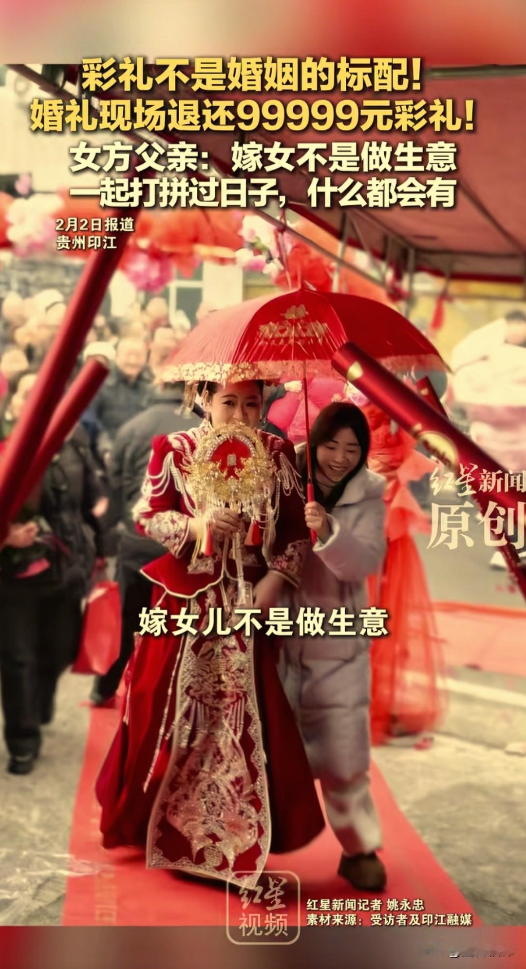岳父婚礼现场退还99999元彩礼,还倒贴6万!一句话让全网破防:嫁女不是做生意 婚礼现场,岳父当场退还女婿送来的99999元彩礼,还额外陪嫁6万元!一句话让全网破防:“嫁女儿不是做生意。” 2026年1月29日,贵州铜仁市印江土家族苗族自治县,一场婚礼让很多人看了心里暖暖的。婚礼上,新娘的父亲陈先生做了一个让全场都特别感动的事:当场把女婿送来的99999元彩礼原封不动退了回去,当成给小两口新生活的一份特殊礼物。这对父母的做法,很快就在网上收获了无数点赞。 他们不光退了彩礼,还额外陪嫁了6万元。有人不理解,陈先生很朴实地说:“嫁女儿不是做生意,我们当父母的,没能力多帮衬孩子,但至少不能给他们压力,只要两个孩子过得好,我们就心满意足了。” 新娘妈妈也说:“我们养姑娘不容易,人家养儿子也不容易。” 更让人佩服的是,当地村干部说,这已经不是他们家第一次这样做了,几年前大女儿出嫁,他们也没要彩礼。 “没能力去帮助,但至少不能给压力。”这句话,说出了为人父母最实在、最朴素的心愿。 陈先生一家的做法,不只是一家人的善意,也跟当地越来越好的社会风气分不开。最近这些年,印江县乃至整个铜仁市,都在大力推进婚俗改革,反对高价彩礼、大操大办这些旧习俗,提倡零彩礼、低彩礼、婚事简办的新风气。 当地通过村规民约、日常宣传、评选文明家庭等方式,让“重感情、轻彩礼”的观念慢慢深入人心。 陈先生家这件事,也给身边的乡亲们立了一个特别好的榜样。 这件温暖的事被报道之后,很快就得到了大家的关注和好评。 网友们纷纷说: “这才是真正为儿女着想的父母,这是嫁女儿,不是卖女儿!这样的家庭,日子肯定差不了。” “彩礼不是婚姻的标配,三观正的父母,才能养出三观正的孩子。” “深明大义的长辈,家庭一定和睦幸福。比起几十万彩礼,这样的家风才是最珍贵的财富。” 真希望这样明事理的父母越来越多,让彩礼回归原本的祝福,而不是一场交易。 陈先生用行动告诉大家:最珍贵的“彩礼”,是父母的理解与支持;最踏实的“嫁妆”,是两个人自立自强、好好过日子的信念。 这一退一赠里,藏着长辈最真诚的祝福: 愿两个年轻人,因为真爱走到一起,同心协力,用自己的双手把日子过好。 这样淳朴善良的家风,正是我们这个社会最需要的正能量。 婚宴彩礼 订婚退彩礼 彩礼八十万 彩礼谈崩后 彩礼价目表 彩礼谈崩