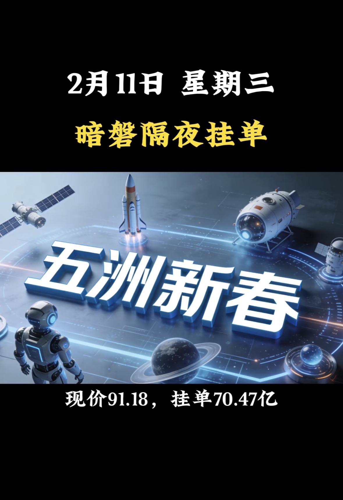 2月11日暗磐隔夜挂单,五洲新春,现价91.18,挂单70.47亿 "暗磐隔夜挂