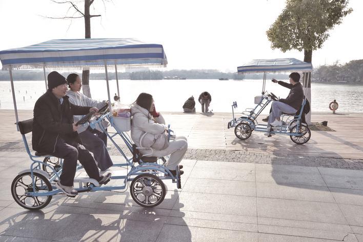昨天,在嘉兴市区南湖天地,游客们有的骑共享自行车,有的驾共享电动车,沿着南湖边享受悠闲时光。
