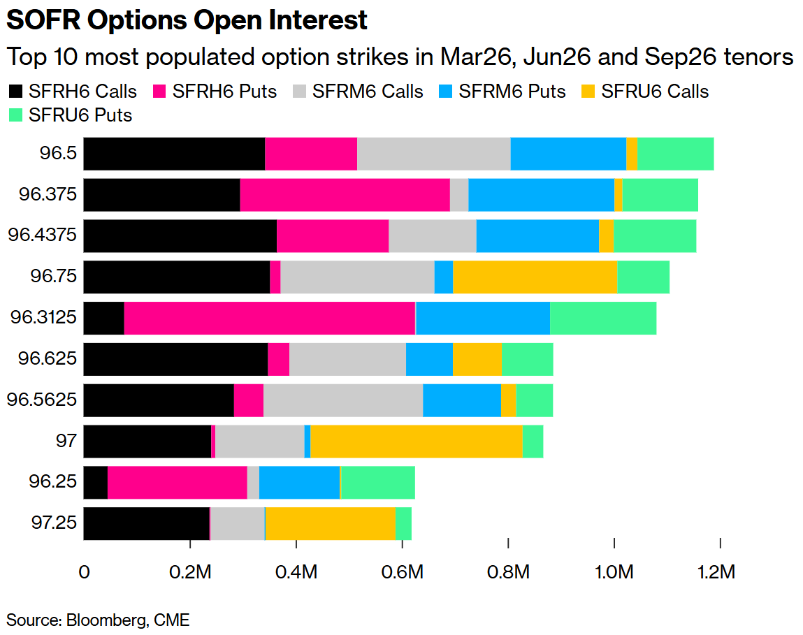 在截至2026年9月到期的SOFR期权中,过去一周,围绕2026年3月到期的期权,市场对上涨行权的需求较为强劲,例如SFRH696.4375/96.50/96.5625和SFRH696.375/96.4375/96.50行权价的看涨期权组合。此外,96.375行权价在过去一周也出现在一些2026年6月到期的看跌期权结构中,例如SFRM696.4375/96.3752x3看跌期权价差组合。过去一周的交易亮点之一是旨在实现最多三次降息的结构,其中96.75行权价活跃,这得益于SFRU696.75/97.00/97.25/97.50看涨鹰式期权和SFRU696.75/96.875/97.125/97.375破损看涨鹰式期权的大买家。