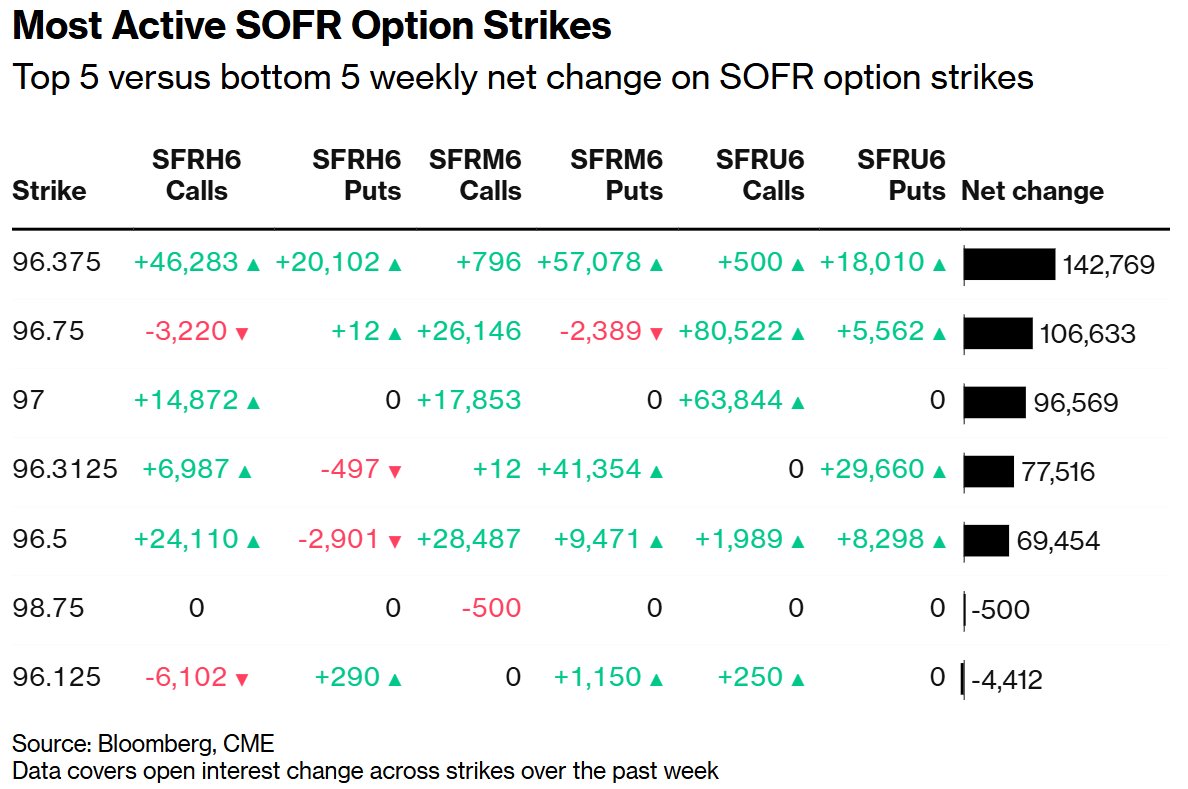 总体而言,在3月26日、6月26日和9月26日到期的期权中,成交量最大的行权价仍然是96.50,该价位持有大量3月26日到期的看涨期权和6月26日到期的看涨期权未平仓合约。近几周来,96.375行权价的需求也出现激增,目前持有大量3月26日到期的看涨期权和看跌期权,以及6月26日到期的看跌期权未平仓合约。