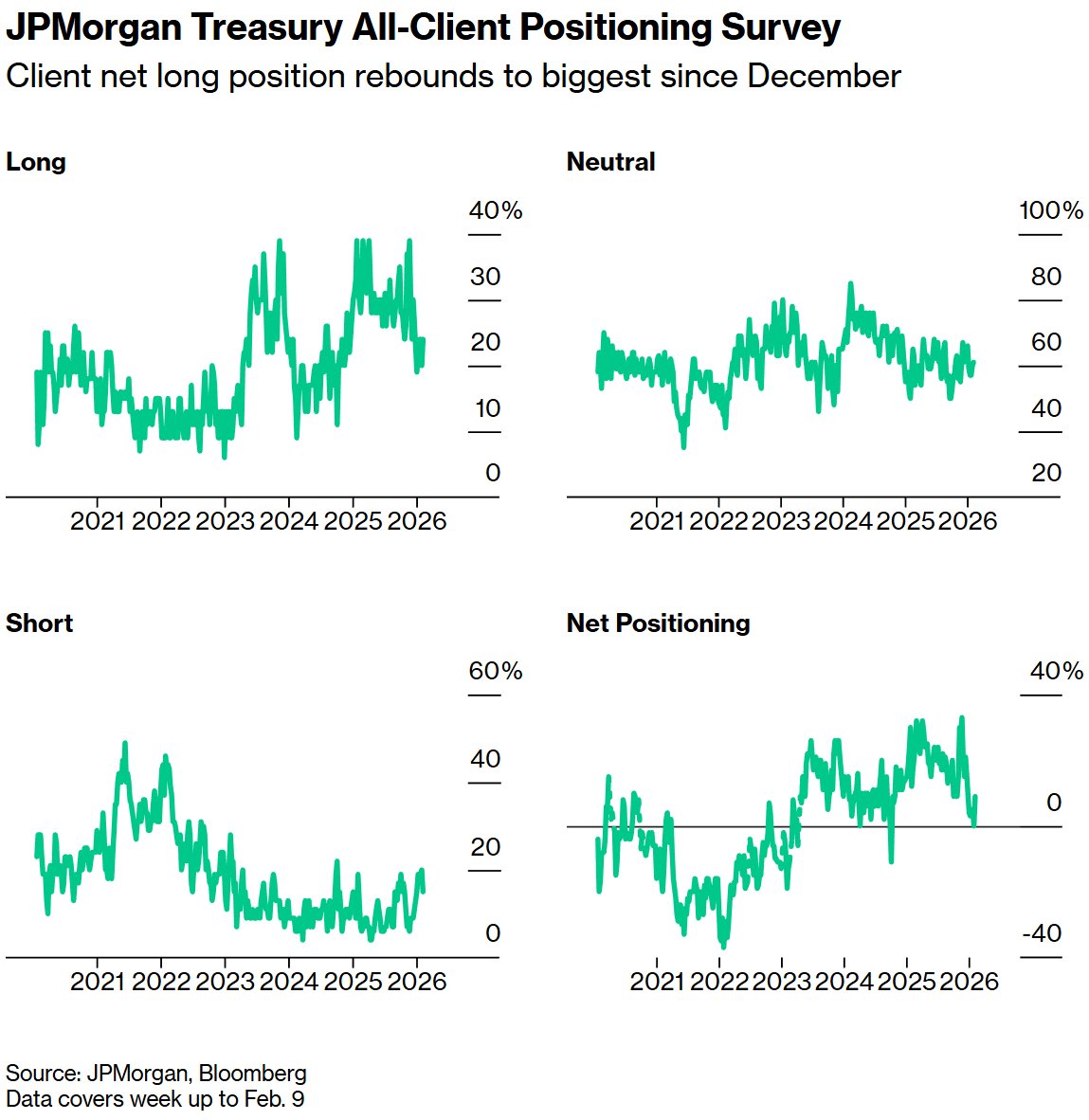 截至2月9日当周,客户净多头头寸增加了4个百分点,空头头寸减少了5个百分点。最终结果是自去年12月以来最大的多头头寸。