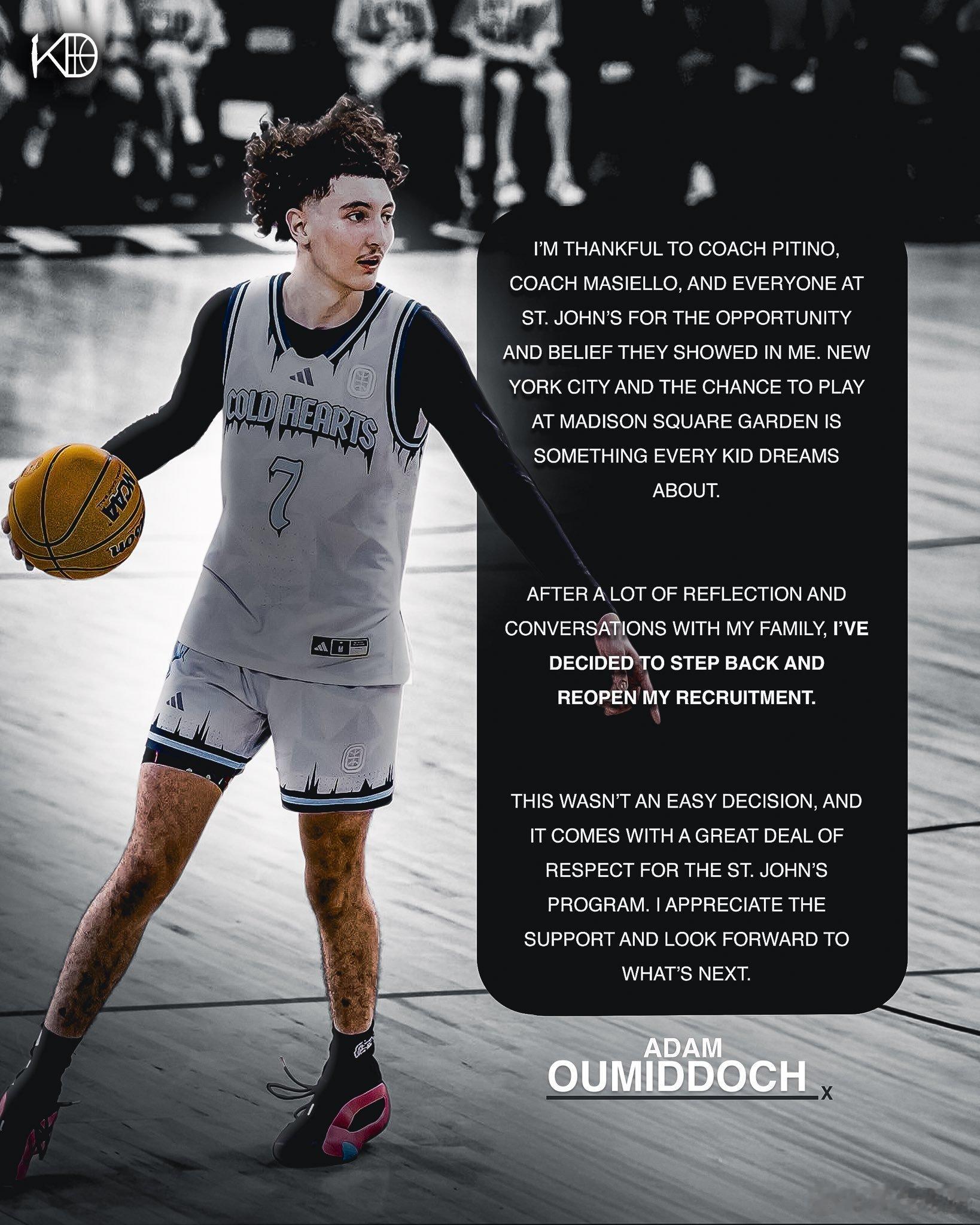 NCAA 原本承诺圣约翰的26届四星后卫Adam Oumiddoch宣布重新开放