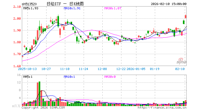 2月10日,日经ETF(513520)涨3.69%,成交额5.65亿元。当日份额增加50.00万份,最新份额为10.13亿份,近20个交易日份额增加1000.00万份。最新资产净值计算值为20.21亿元。