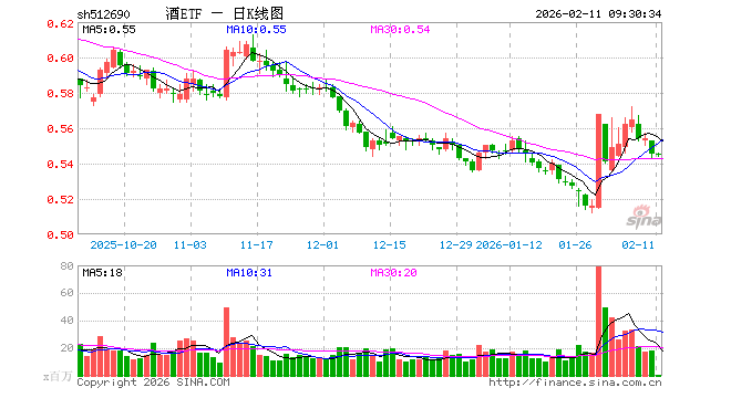 2月11日,酒ETF(512690)开盘涨0.00%,报0.545元。酒ETF(512690)重仓股方面,贵州茅台开盘涨0.00%,五粮液跌0.18%,泸州老窖跌0.01%,山西汾酒涨0.02%,洋河股份跌0.15%,今世缘涨0.00%,青岛啤酒涨0.21%,古井贡酒涨0.12%,燕京啤酒涨0.08%,舍得酒业跌0.04%。
