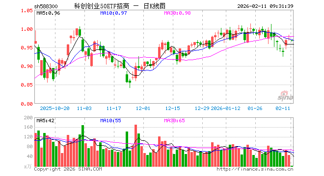2月11日,科创创业50ETF招商(588300)开盘跌0.41%,报0.969元。科创创业50ETF招商(588300)重仓股方面,中际旭创开盘跌0.85%,新易盛跌0.77%,宁德时代涨0.53%,寒武纪跌1.09%,阳光电源跌0.50%,中芯国际跌1.89%,海光信息跌1.54%,胜宏科技跌0.77%,汇川技术跌0.47%,澜起科技跌1.46%。
