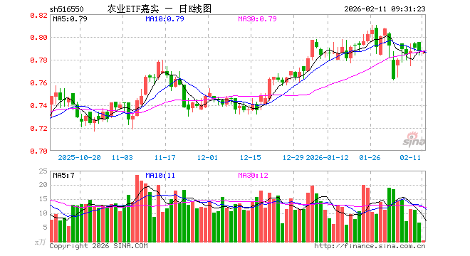 2月11日,农业ETF嘉实(516550)开盘跌0.25%,报0.785元。农业ETF嘉实(516550)重仓股方面,藏格矿业开盘跌0.56%,盐湖股份涨0.00%,牧原股份跌0.09%,海天味业跌0.05%,伊利股份涨0.19%,温氏股份跌0.06%,东鹏饮料跌0.61%,海大集团跌0.17%,云天化跌0.17%,双汇发展涨0.04%。
