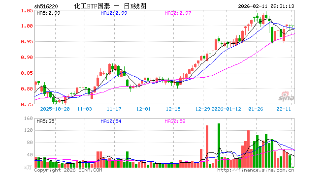 2月11日,化工ETF国泰(516220)开盘涨0.00%,报0.999元。化工ETF国泰(516220)重仓股方面,万华化学开盘跌0.48%,盐湖股份涨0.00%,藏格矿业跌0.56%,天赐材料跌0.05%,巨化股份跌0.23%,恒力石化涨0.00%,华鲁恒升涨0.90%,宝丰能源涨0.00%,云天化跌0.17%,金发科技涨0.05%。