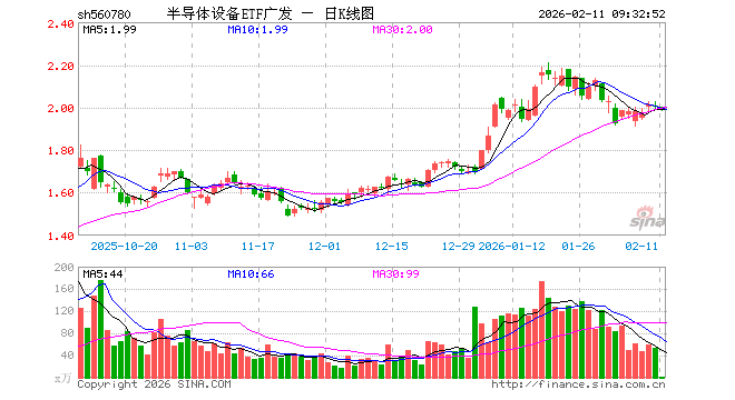 2月11日,半导体设备ETF广发(560780)开盘跌0.35%,报2.000元。半导体设备ETF广发(560780)重仓股方面,北方华创开盘跌0.85%,中微公司跌0.71%,拓荆科技涨0.02%,长川科技跌0.16%,沪硅产业涨0.58%,华海清科涨0.17%,中科飞测涨0.61%,南大光电跌1.92%,安集科技跌0.24%,芯源微涨0.08%。