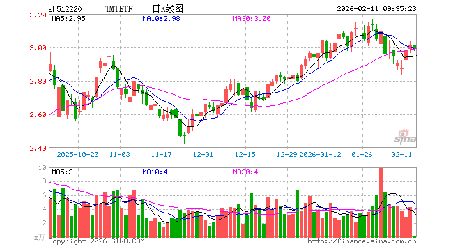 2月11日,TMTETF(512220)开盘涨0.17%,报3.014元。TMTETF(512220)重仓股方面,中际旭创开盘跌0.85%,新易盛跌0.77%,立讯精密跌0.58%,寒武纪跌1.09%,工业富联跌0.84%,中芯国际跌1.89%,海光信息跌1.54%,北方华创跌0.85%,胜宏科技跌0.77%,兆易创新跌1.69%。