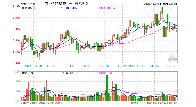 2月11日,农业ETF华夏(516810)开盘跌0.58%,报0.855元。农业ETF华夏(516810)重仓股方面,牧原股份开盘跌0.09%,温氏股份跌0.06%,海大集团跌0.17%,藏格矿业跌0.56%,盐湖股份涨0.00%,亚钾国际跌0.47%,正邦科技涨0.32%,新希望涨0.12%,梅花生物跌0.09%,扬农化工跌2.15%。