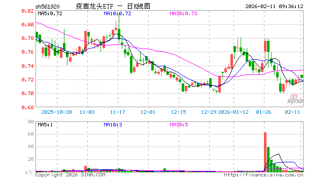 2月11日,疫苗龙头ETF(561920)开盘涨0.83%,报0.726元。疫苗龙头ETF(561920)重仓股方面,智飞生物开盘跌0.11%,沃森生物涨0.32%,万泰生物跌0.12%,辽宁成大涨0.17%,康泰生物跌0.07%,甘李药业跌0.26%,特宝生物涨7.75%,山东药玻跌0.05%,华兰生物跌0.06%,复星医药涨0.15%。