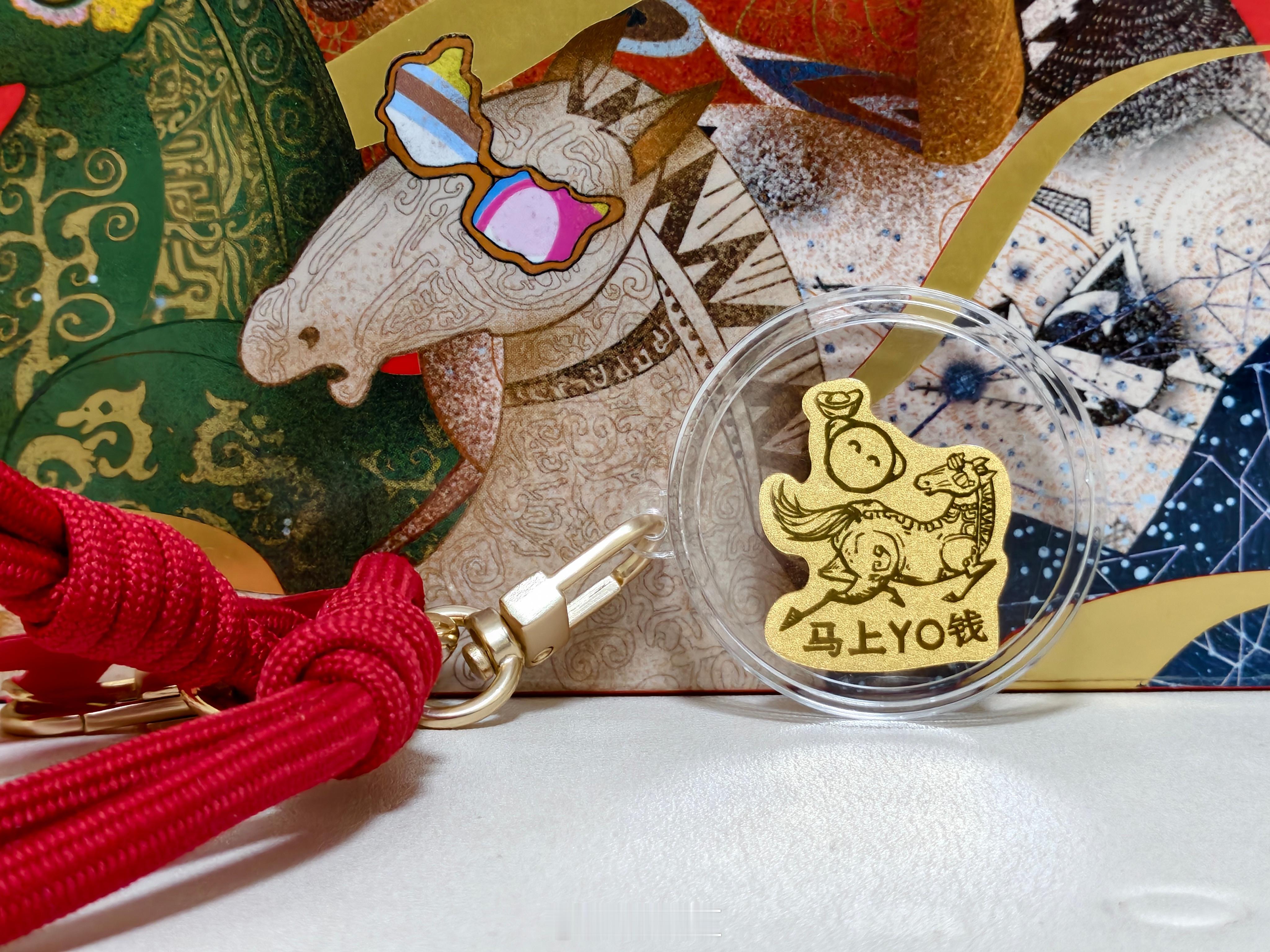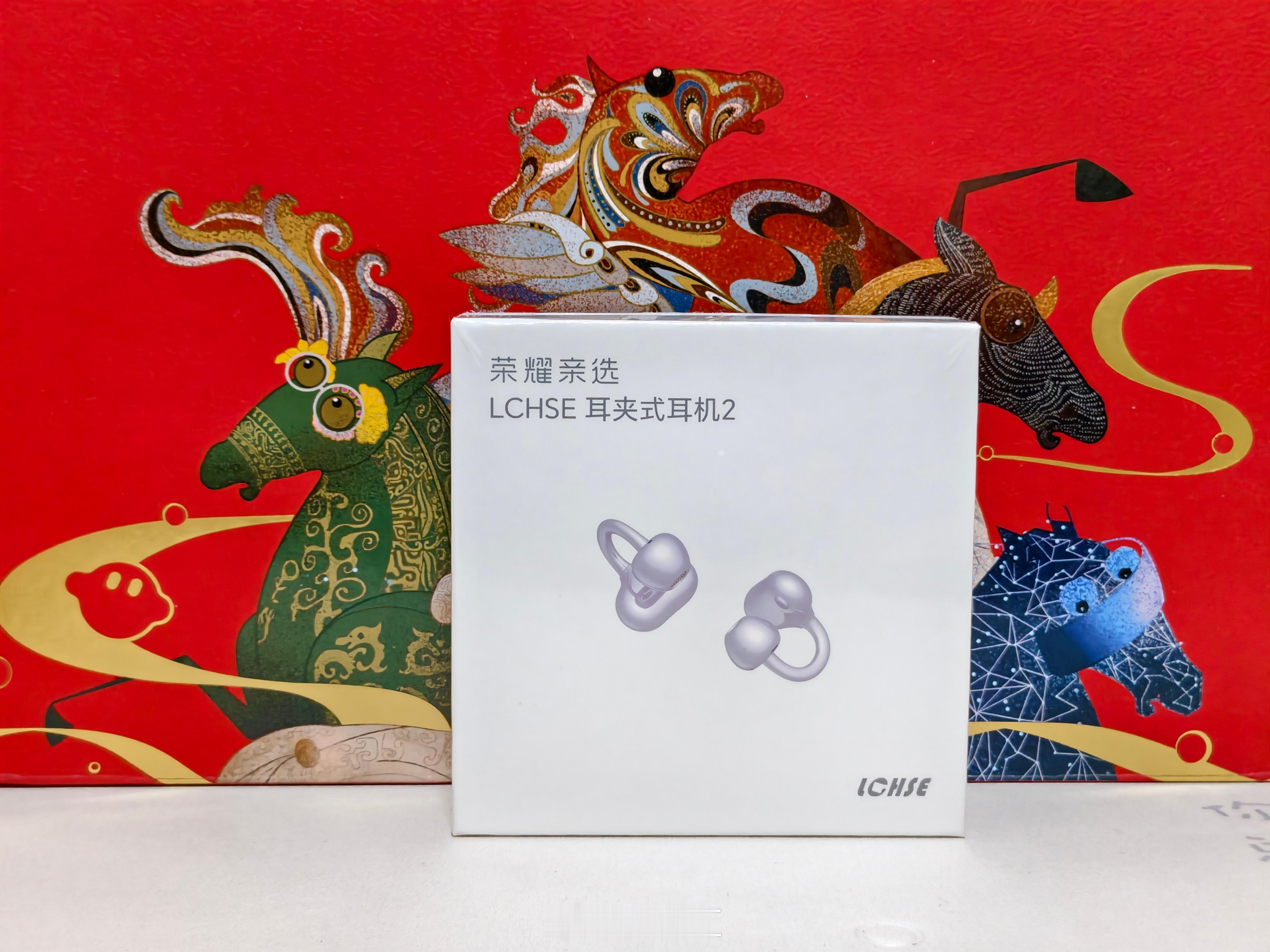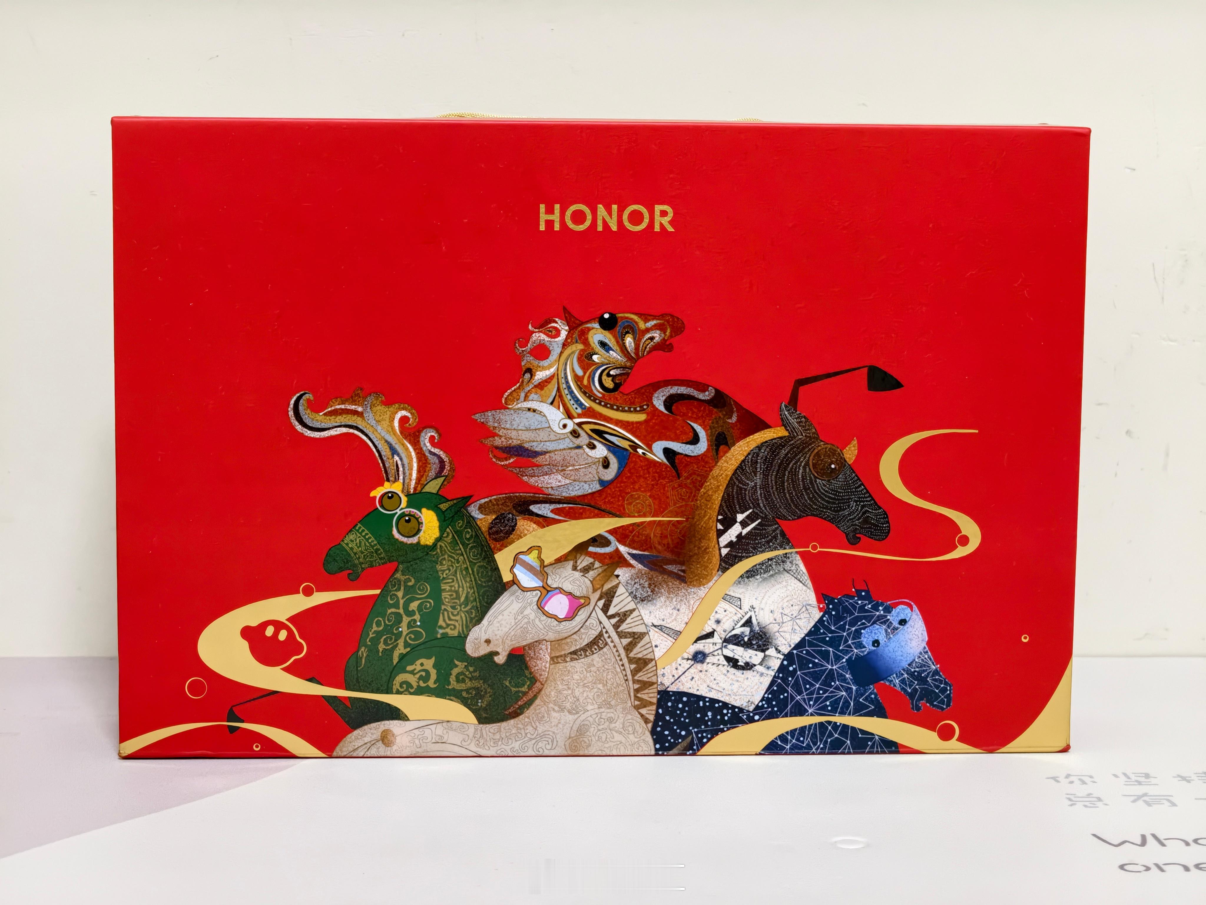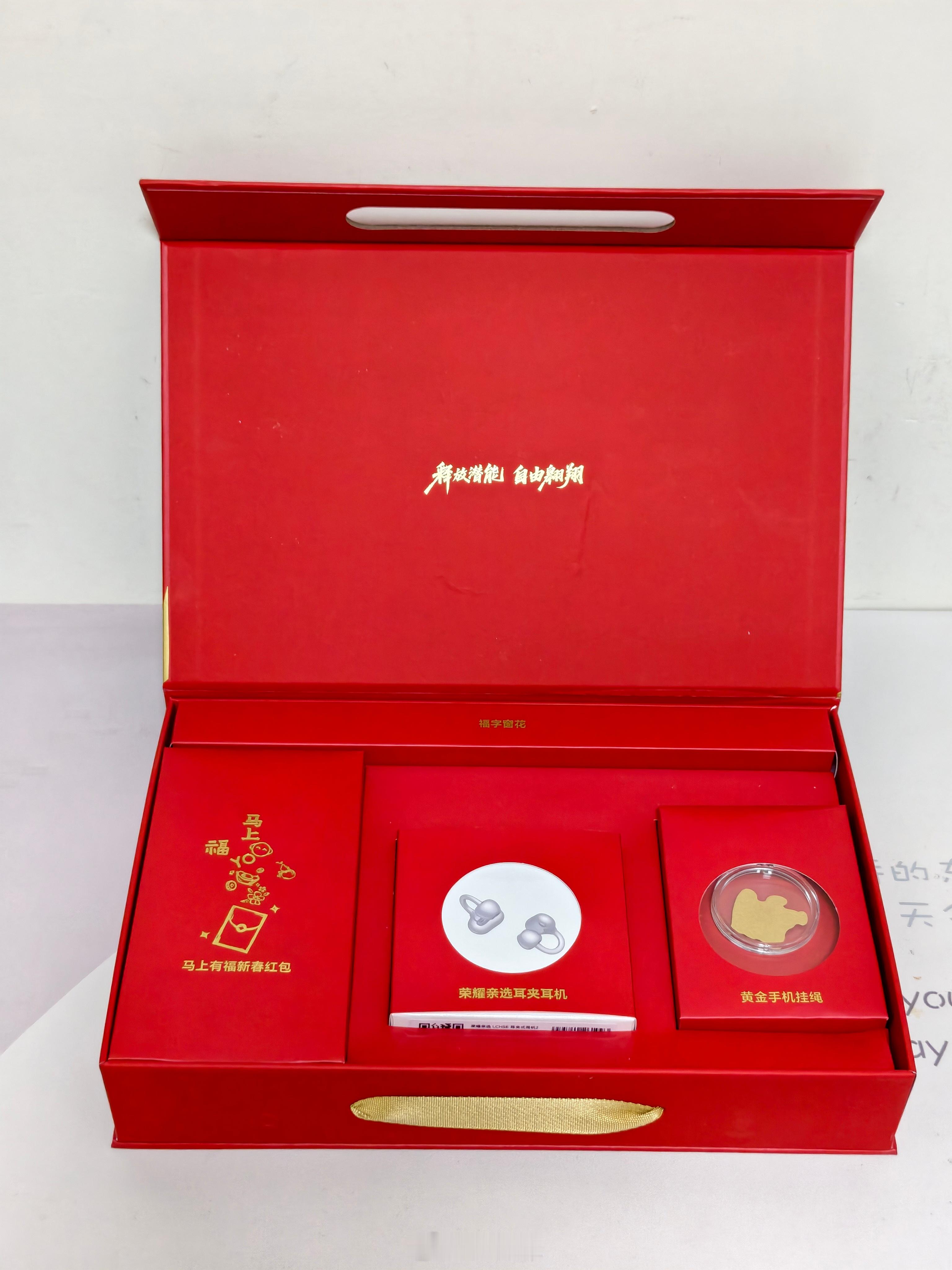 收到了荣耀新年礼盒,里面有荣耀亲选耳夹式耳机、“马上YO钱”足金手机挂饰、新年窗