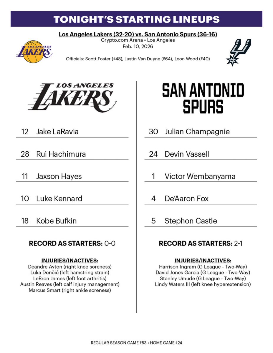 虎扑02月11日讯湖人今天对阵马刺,球队首发出炉: