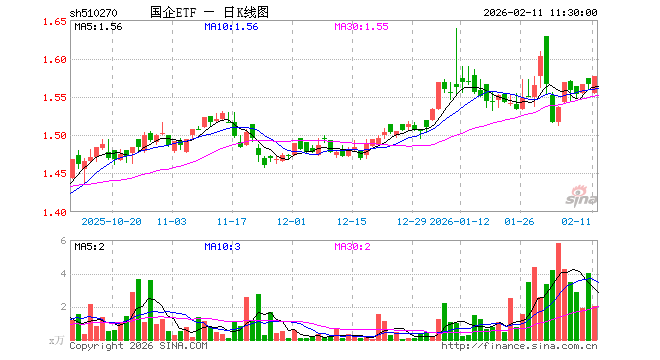 2月11日,截止午间收盘,国企ETF(510270)涨0.64%,报1.576元,成交额323.61万元。国企ETF(510270)重仓股方面,贵州茅台截止午盘跌0.45%,紫金矿业涨2.22%,长江电力跌0.49%,招商银行跌0.20%,中信证券跌0.21%,国泰海通跌0.20%,兴业银行涨0.00%,工商银行跌0.27%,中国船舶涨1.09%,万华化学涨4.12%。