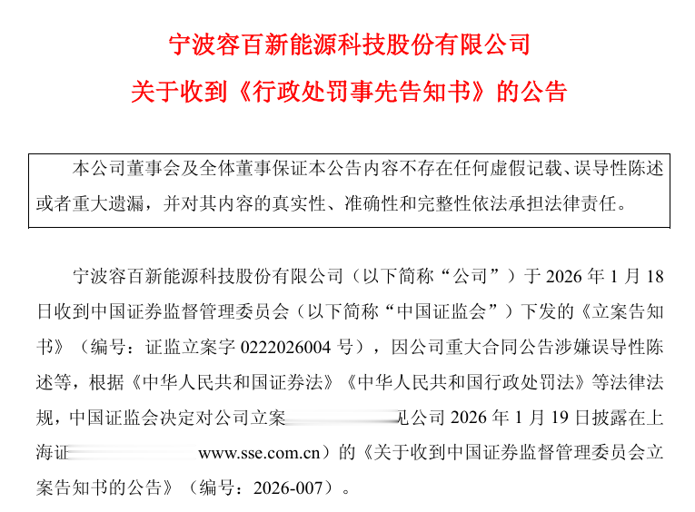 2026年2月7日,宁波容百新能源科技股份有限公司(以下简称“容百科技”)发布公告称,公司于2月6日收到中国证券监督管理委员会宁波监管局(以下简称“宁波证监局”)下发的《行政处罚事先告知书》。公司及董事长兼总经理白厚善、董事会秘书俞济芸因涉嫌信息披露违法被处以警告及罚款。