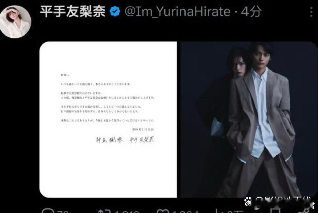 2月11日,原日本女子团体欅坂46成员平手友梨奈官宣与演员神尾枫珠结婚。