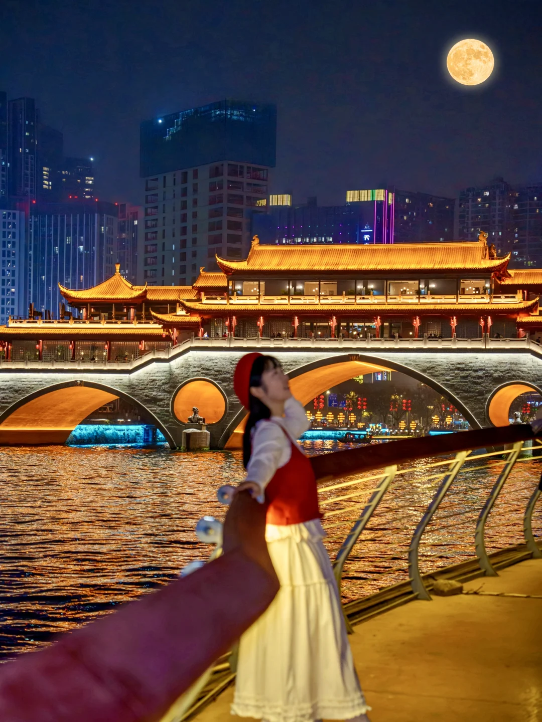 而且还会经过成都的地标建筑合江亭、安顺廊桥,夜幕下的廊桥灯火璀璨,非常浪漫。