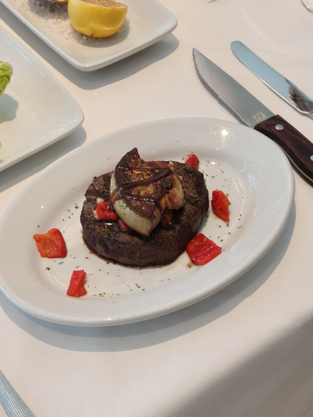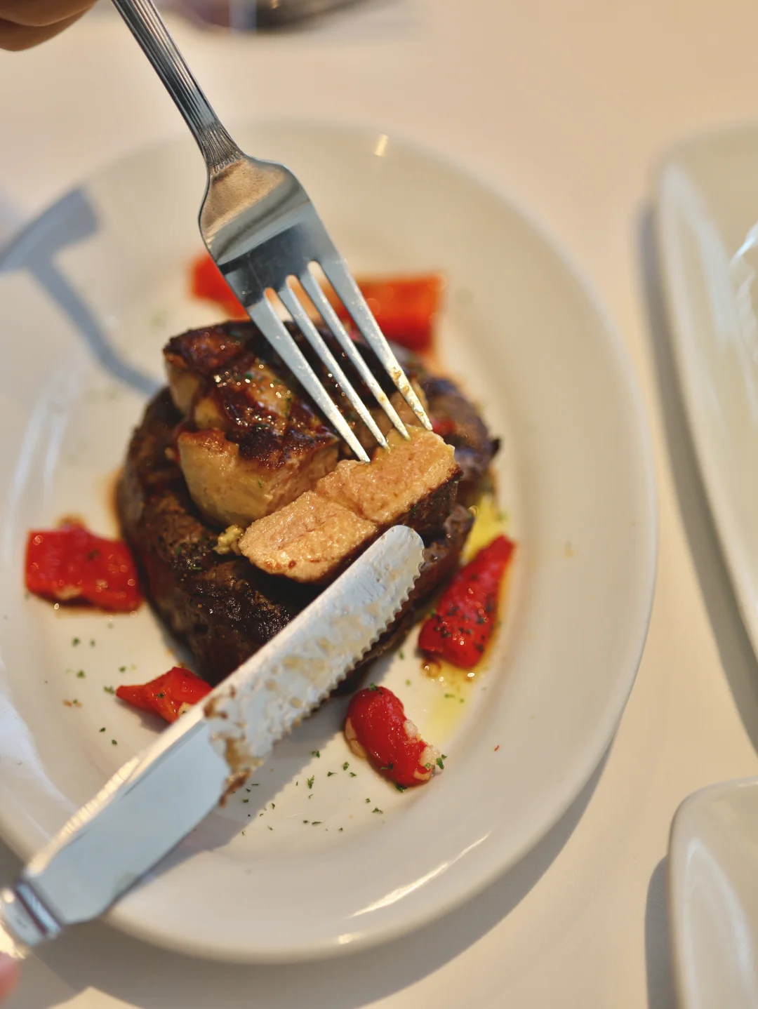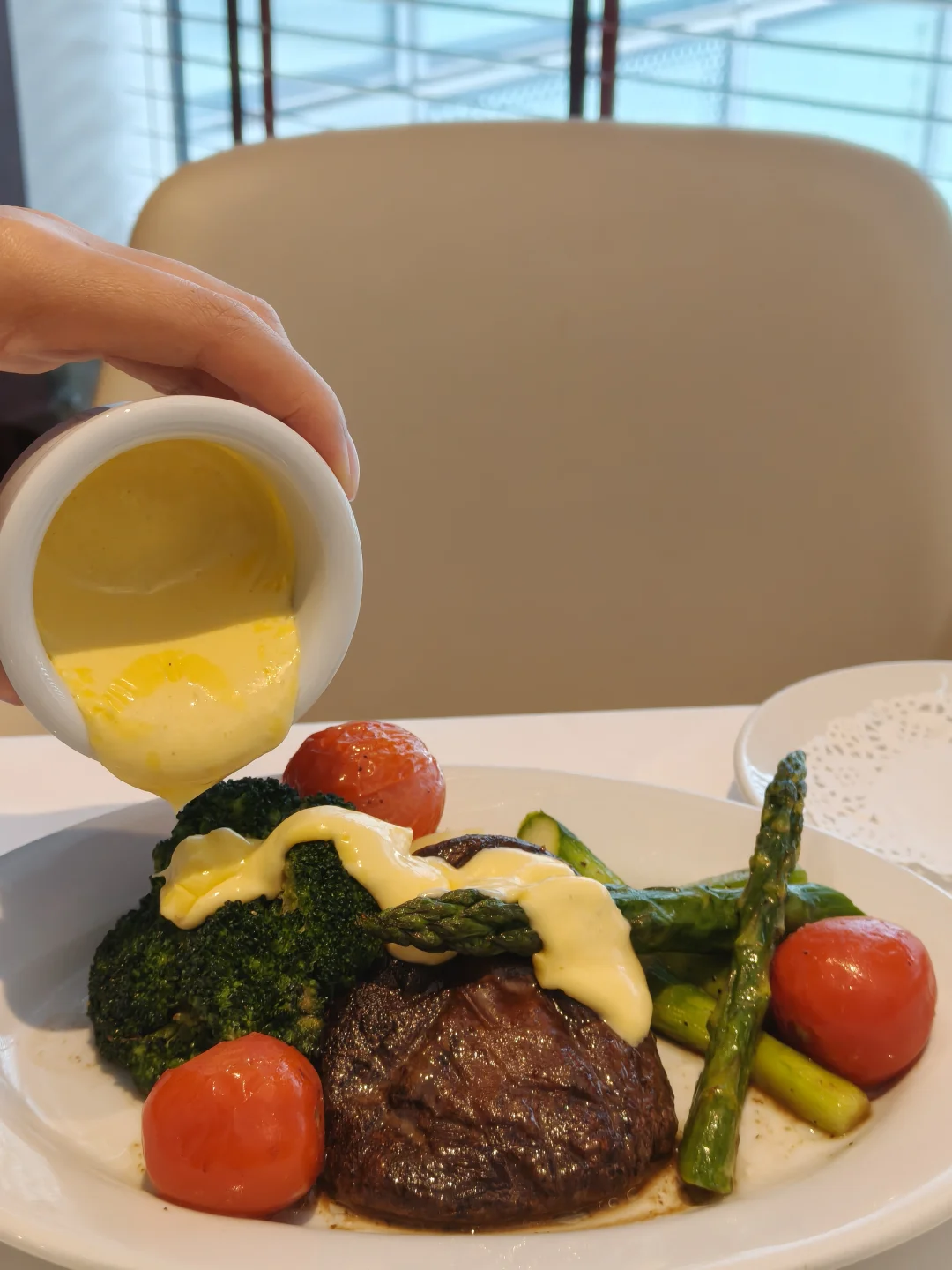🥩主菜选了 「澳洲菲力牛排佐香煎鹅肝」鹅肝煎得外脆内润,入口像温柔的奶油~牛排切开是漂亮的粉红色!肉质细嫩,汁水锁得很好~