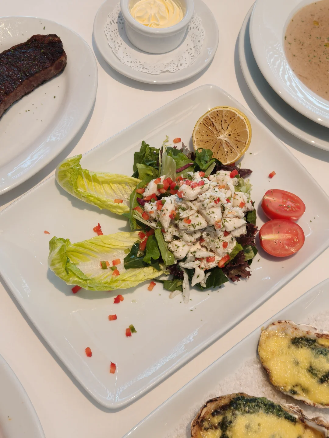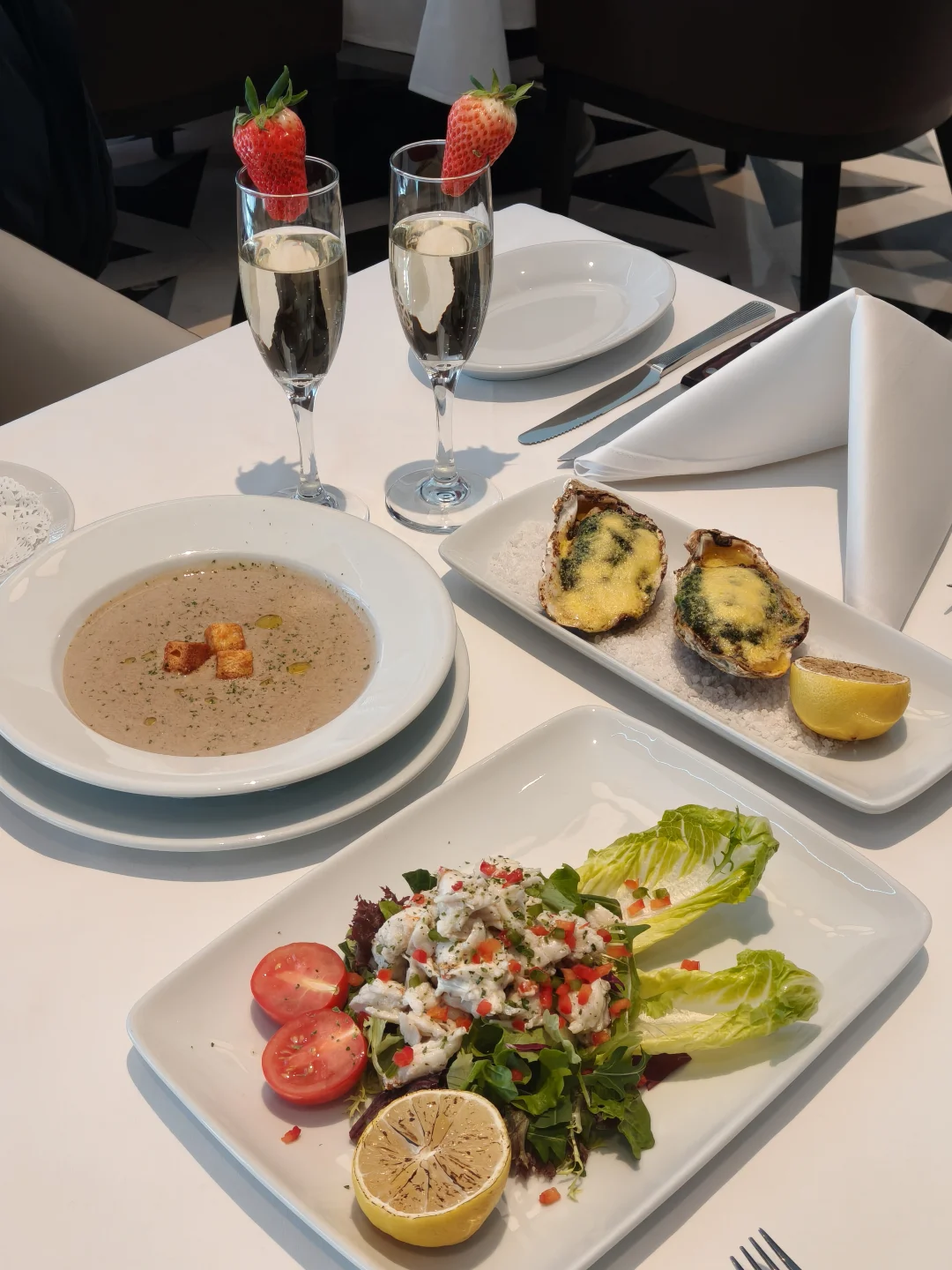 🦪前菜「洛克菲焗烤鲜蚝」菠菜和芝士焗烤得微微焦香,蚝肉依然饱满润口,一勺挖下去,海洋的鲜和奶香味融合得刚好