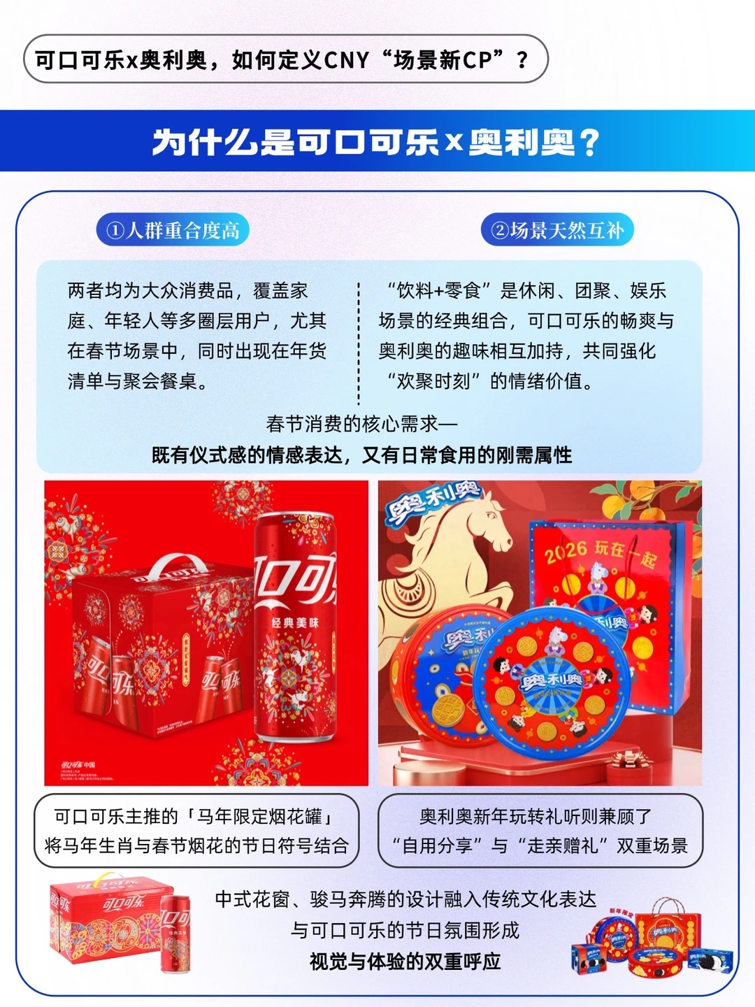 2️⃣「饮料 + 零食」的品类属性,天然适配休闲、团聚等场景,可口可乐的畅爽与奥利奥的趣味相互加持,精准承接了春节“合家欢”的情绪需求。