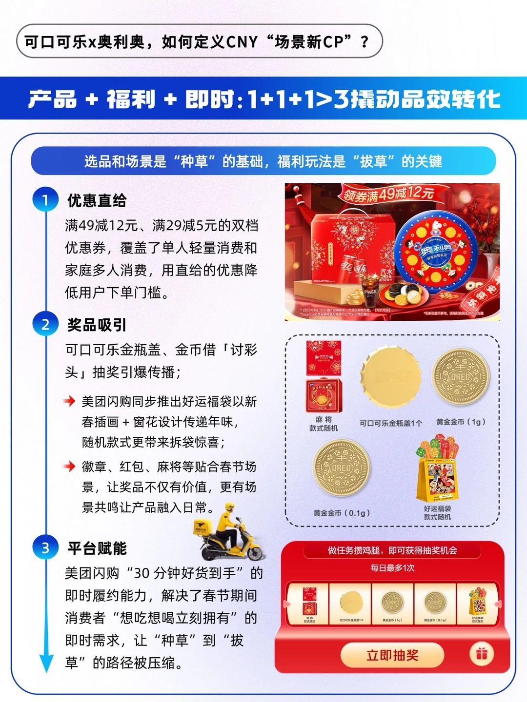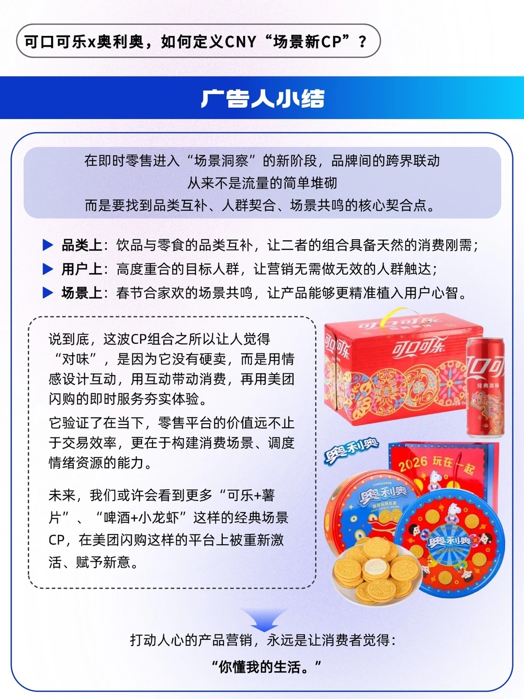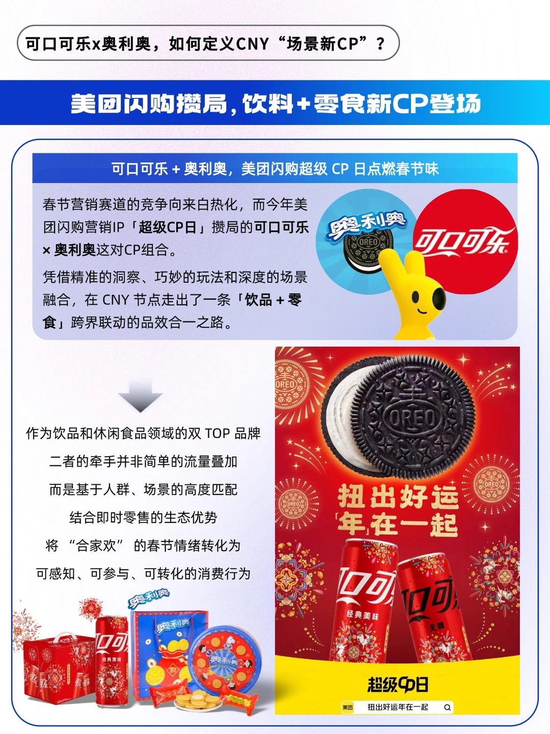 🔵今年,美团闪购营销 IP「超级 CP 日」跳出常规,攒局可口可乐与奥利奥,以「饮品 + 零食」的跨界组合,在 CNY 节点走出了一条品效合一的新路径。