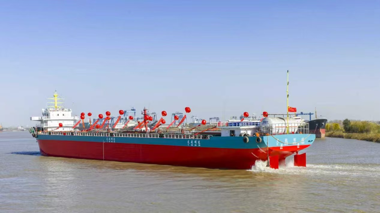 “义航鸣远”轮总长119.8米,总吨位6573吨,由企业投资2600万元建造。该船配备两台单一气体燃料发动机,全程使用LNG清洁能源驱动,相比传统柴油动力船舶,可显著减少硫氧化物、氮氧化物、颗粒物和二氧化碳排放,具有突出的环保与节能效益。