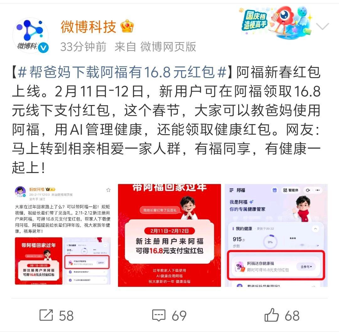 帮爸妈下载阿福有16.8元红包 又有红包🧧这次是阿福!规则很简单,新注册就送1