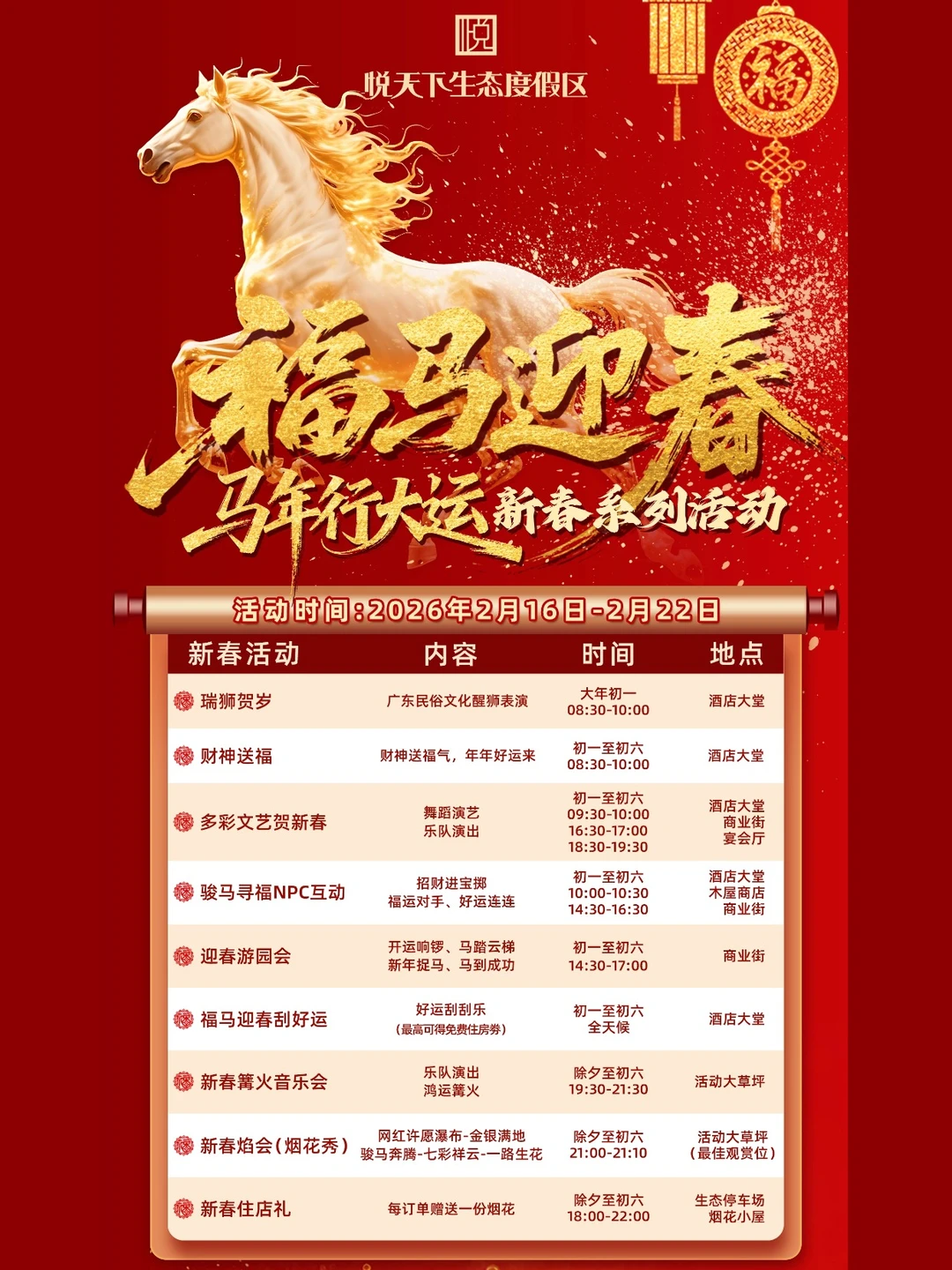 把地道的年味、热闹的活动和放松的假期,都打包进了悦天下度假区里。