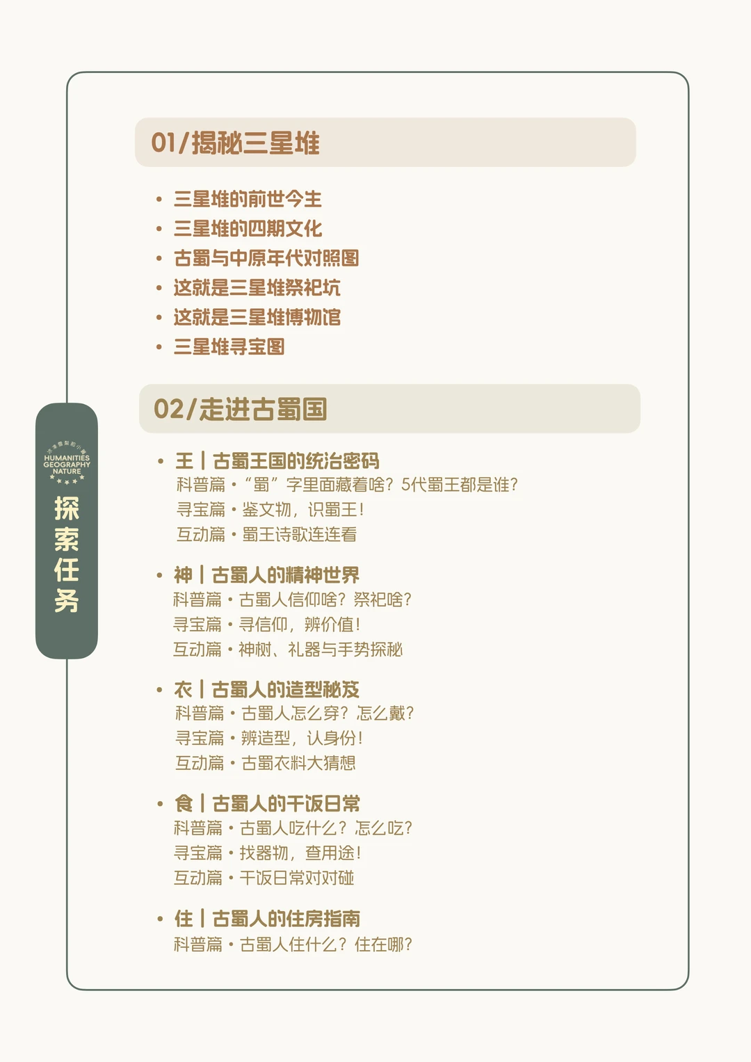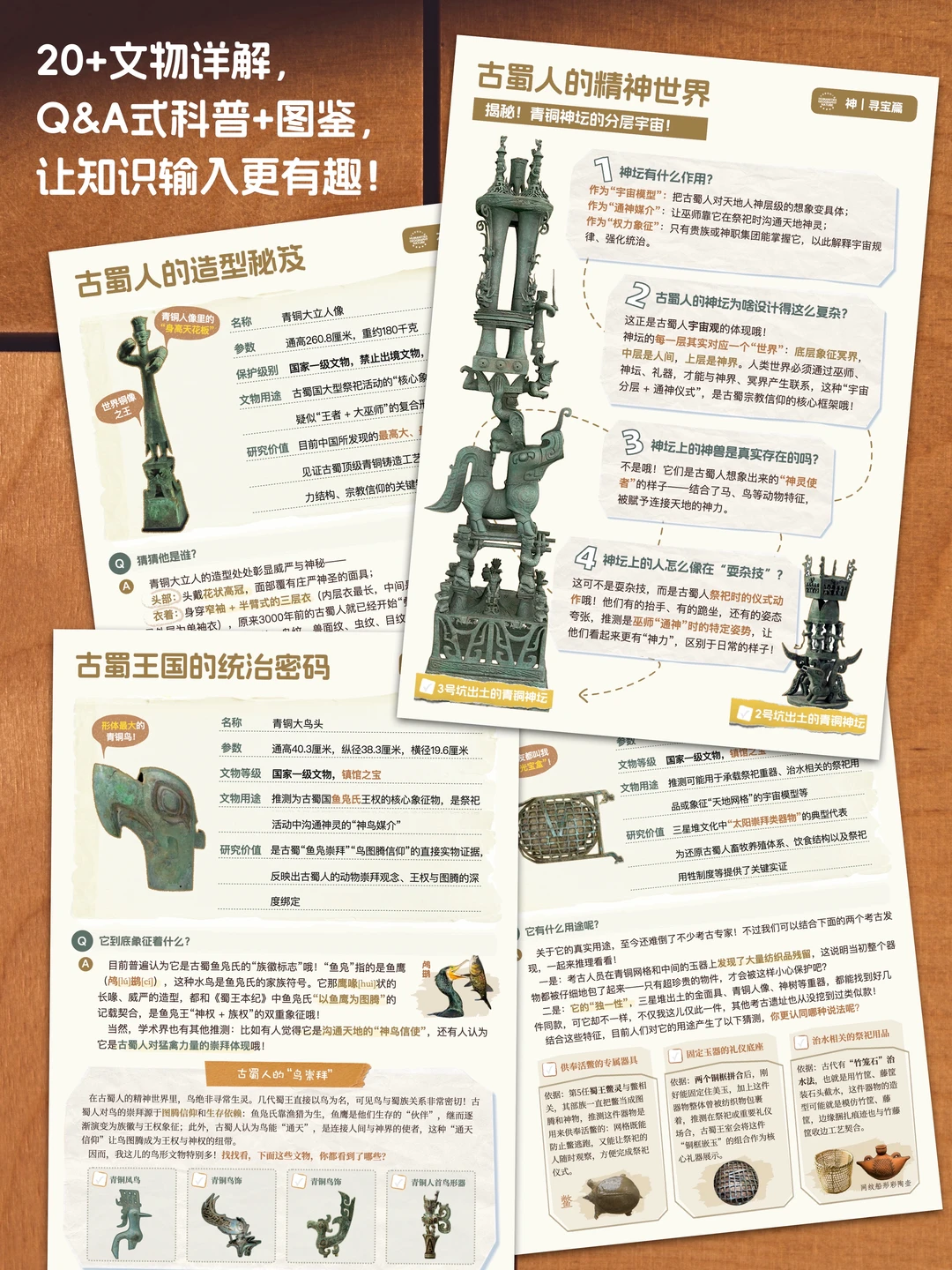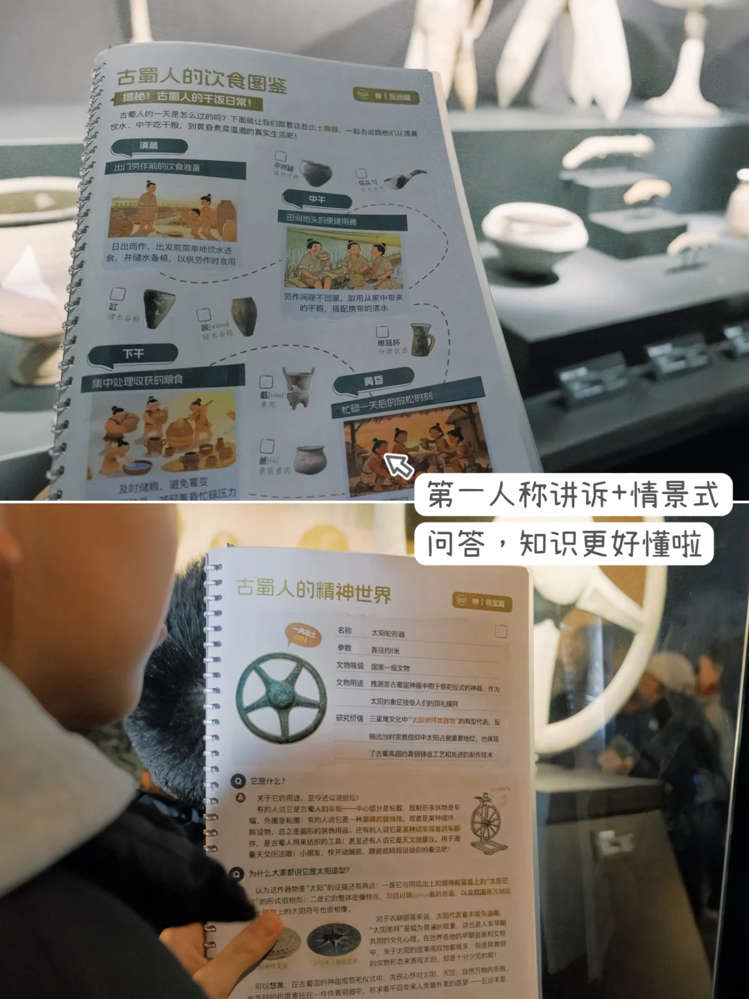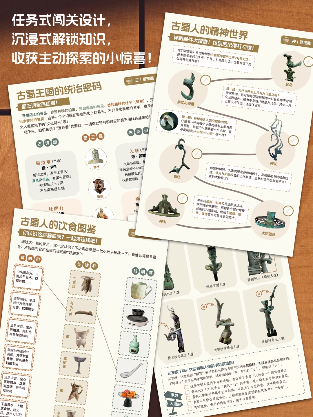 ✌️每一件文物都配有第一人称讲述和情景式问答,每一章节都设置了互动拓展任务,孩子不再是旁观者,而是能通过自主思考,真正共情:神权王国里,一个古蜀人的一生如何度过?