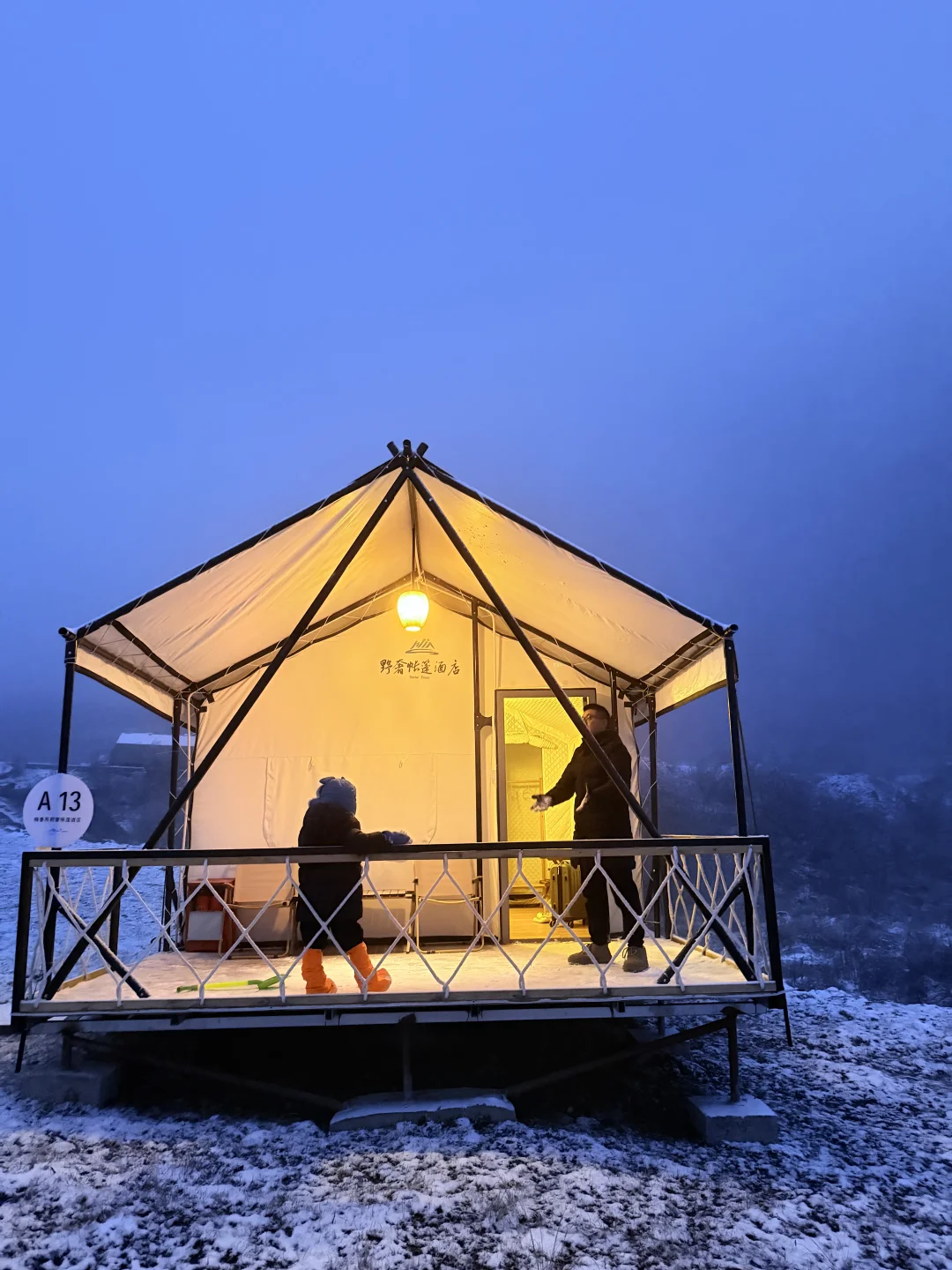 🏨住宿:我们入住的是景区的帐篷⛺酒店,有电暖气,小朋友初体验帐篷酒店,感觉很不错,早上起床拉开门白茫茫的一片,还拍到了绝美蓝调时刻!