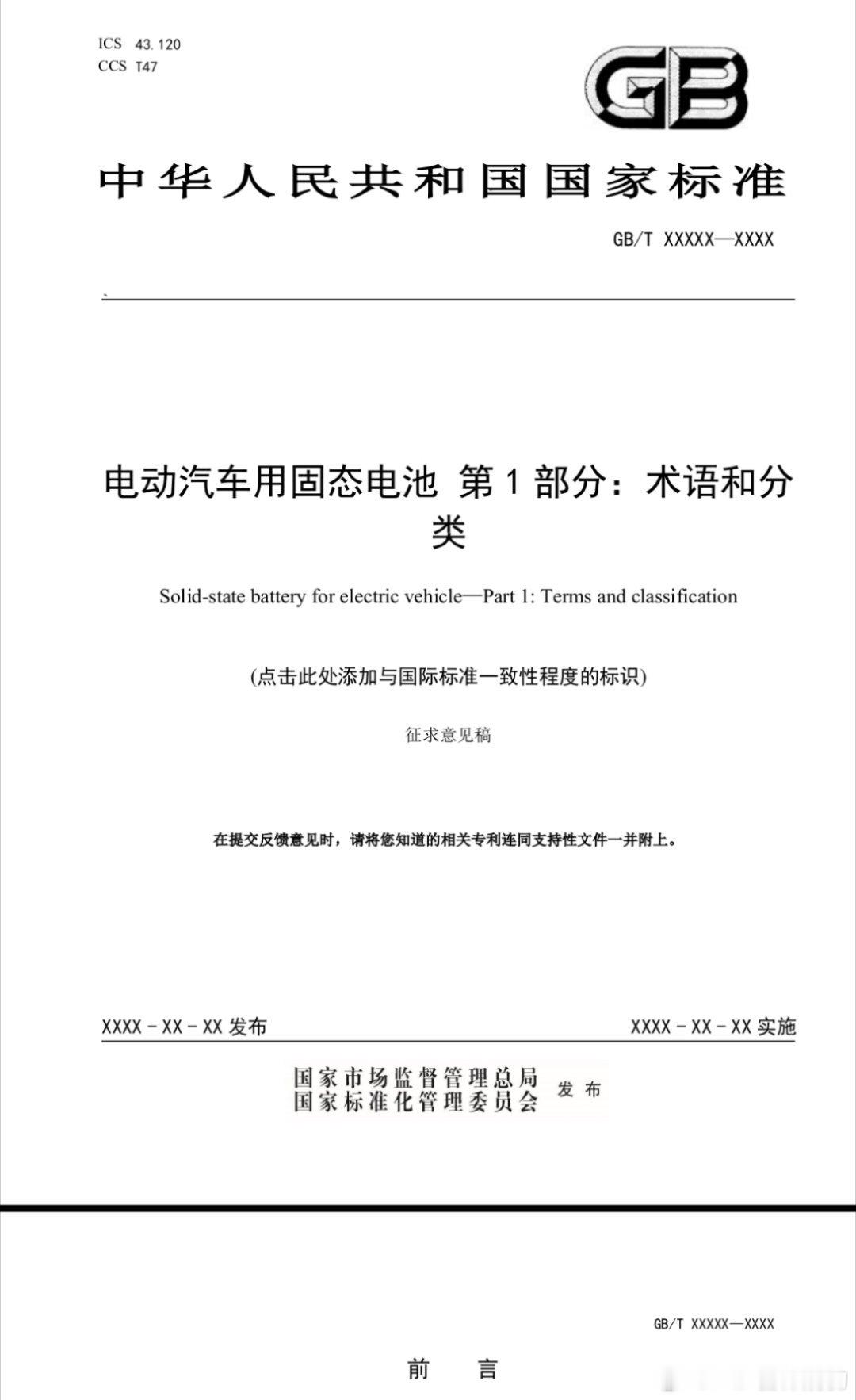 车用固态电池国标固态电池国标(征求意见稿) 是技术路线分水岭:1. 明确固态/混合固液/液态三类划分,半固态=混合固液、全固态=固态,终结概念混乱 2. 用120℃真空6h失重≤0.5% 划清固态与液态边界,比团标更严 3. 直接加速固态产业化,倒逼三元/磷酸铁锂加速迭代或收缩