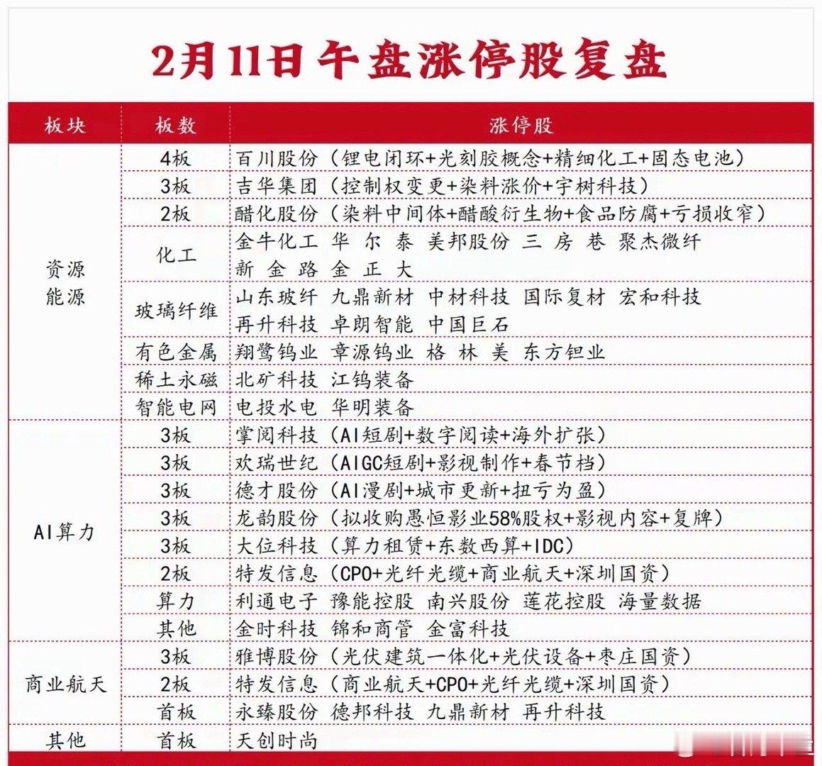 化工板块(分散染料、农药、大炼化等方向均表现不俗):吉华集团5天4板,三房巷、百川股份、醋化股份、华尔泰涨停,红太阳、荣盛石化、山东海化、新疆天业等跟涨。(日前,浙江龙盛分散染料部分品种再度调价,2月8日分散染料黑报价近期累计上涨5000元/吨。此外草铵膦等94个农药品种自2026年4月1日起增值税出口退税)