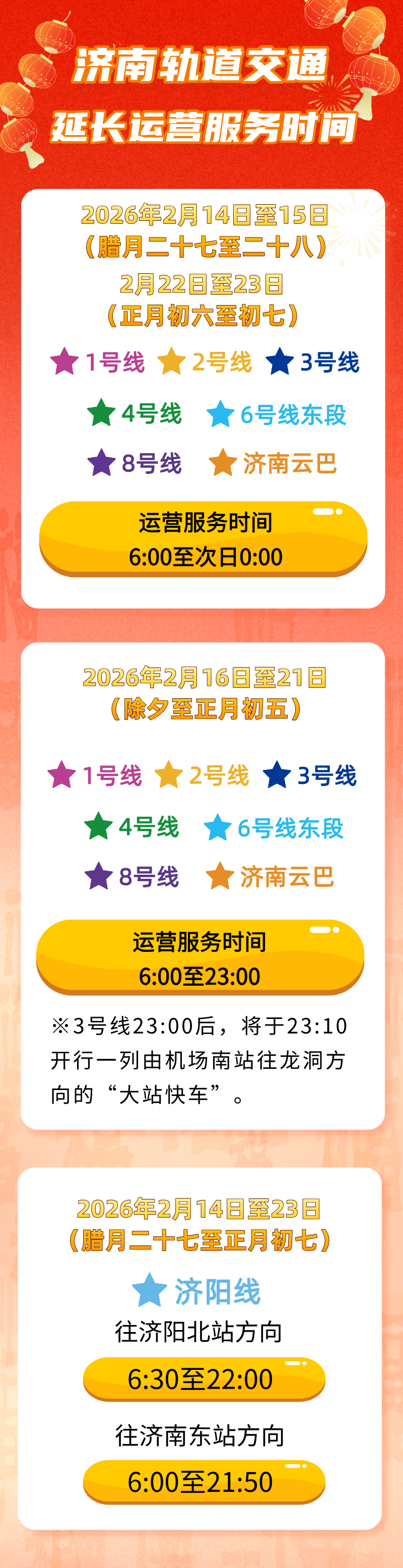 为满足市民乘客出行需求,济南轨道交通将于2月14日至2月23日(腊月二十七至正月初七)延长运营服务时间。