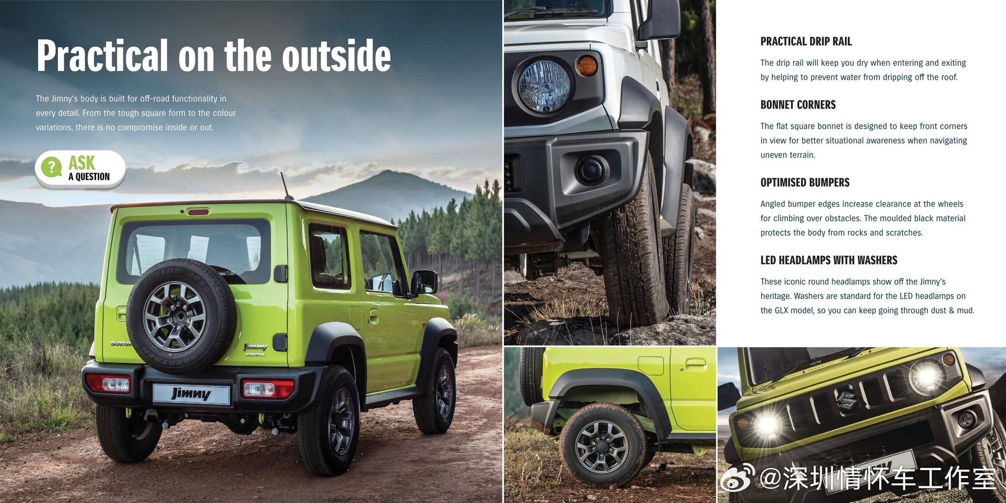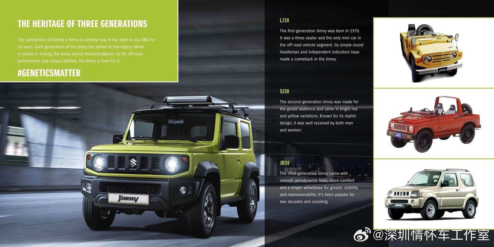 吉姆尼创造的历史(里程碑)• 全球首款量产轻型四驱车(1970 LJ10),开创小型硬派越野品类开创迷你硬派品类,1970年LJ10是日本首款量产轻自动车级越野车,以小车身实现专业越野能力,打破大型越野垄断。• 55年四代传承,始终坚持非承载式+梯形车架+带低速档的分时四驱,几乎未向城市SUV妥协;三门短轴成为吉姆尼的标志性形态(五门是近年补充)。• 全球销量超300万台(截至2020),覆盖199国,平民越野文化符号• 改装文化天花板:原厂/副厂件极丰富,越野/复古/城市风格全覆盖,保值率逆天• K‑Car越野独苗:日本本土窄体版,合规又硬核,全球独一份