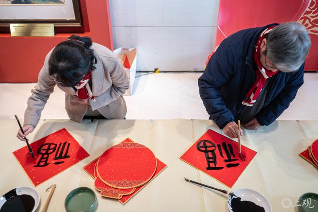 书画名家们齐聚案前,饱蘸浓墨,提笔落纸间,一个个笔力遒劲、寓意吉祥的“福”字跃然红宣,楷隶行草各有韵味,尽显海派书画的独特魅力,现场观众纷纷驻足观摩,不时发出赞叹。