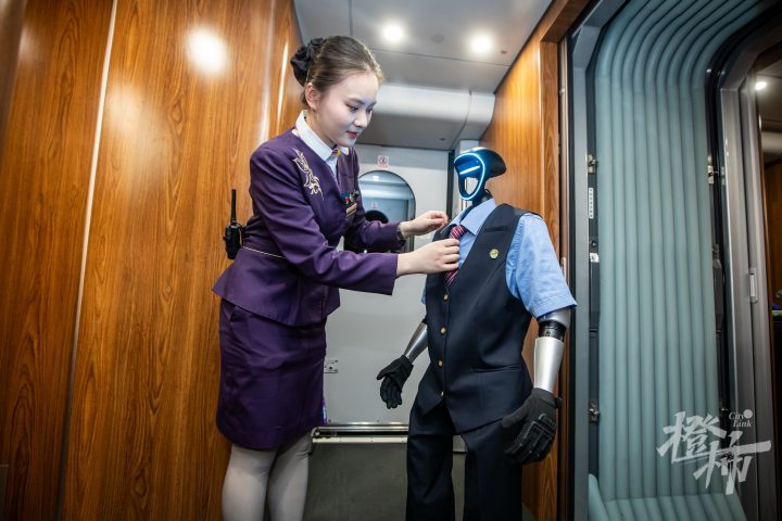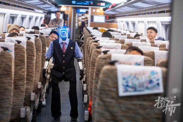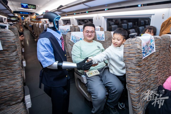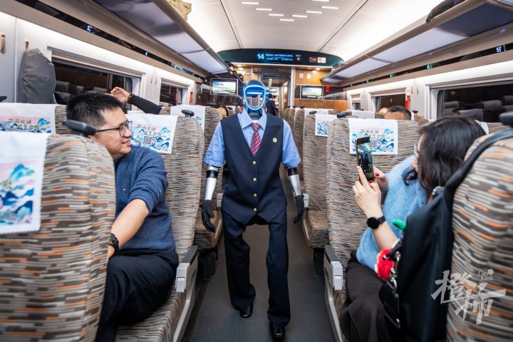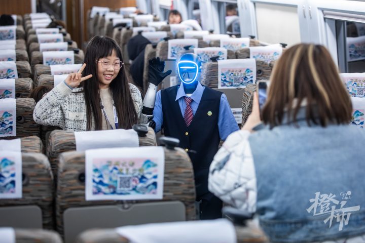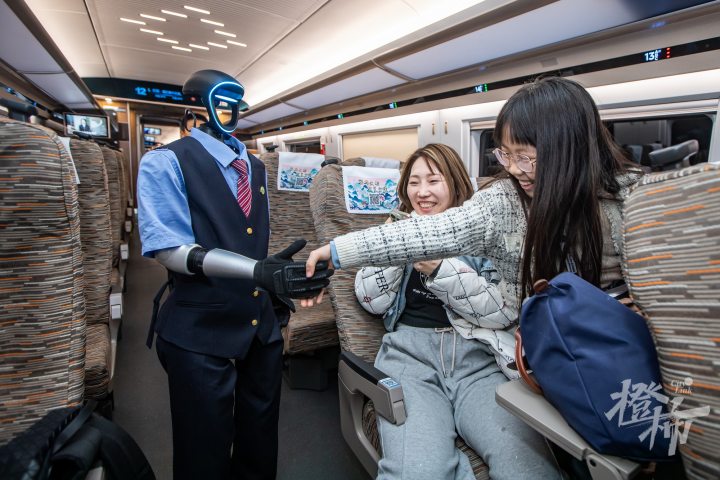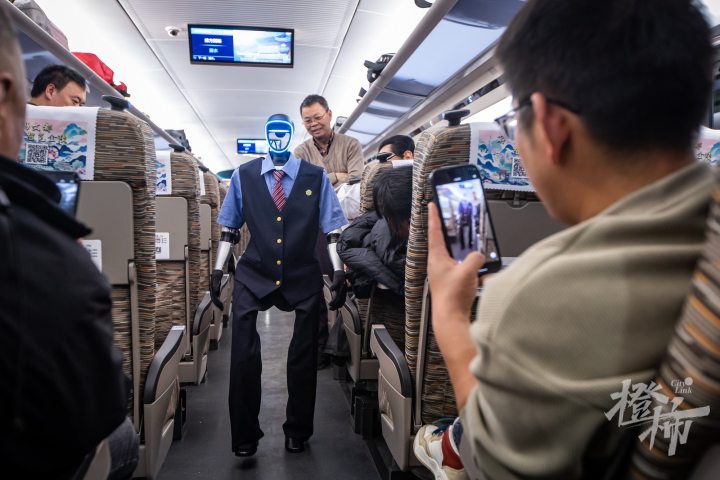 旅客施先生见到“福兴”很兴奋,一边握手一边拍照。他说:“我经常坐高铁往返杭州和北京,这个机器人乘务员,真的刷新了我对铁路服务的认知。感觉像多了个‘赛博朋友’,或许未来的旅行,就是人和机器人一起坐着车聊段子。”