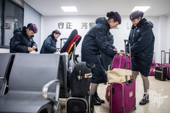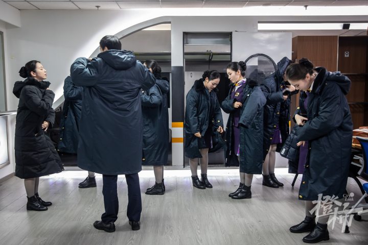 出乘进站前,“西子号”乘务组列车员们穿上羽绒防寒服,并整理乘务箱和备品。