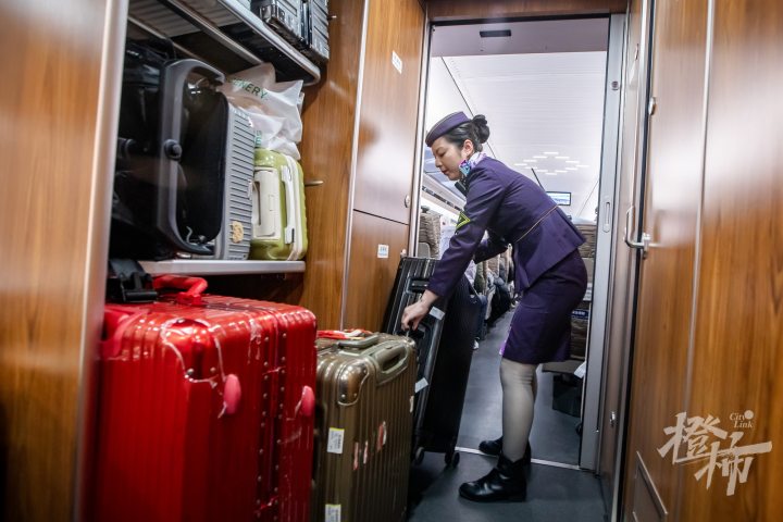 这几天旅客多,行李也多,为了不影响过道通行,每当发车后,列车员们第一时间要把大大小小的行李箱摆放到合适的位置。