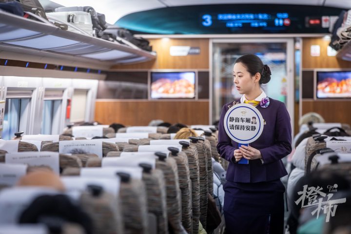 列车员拿着“保持安静”的提示牌在静音车厢内巡视提醒。