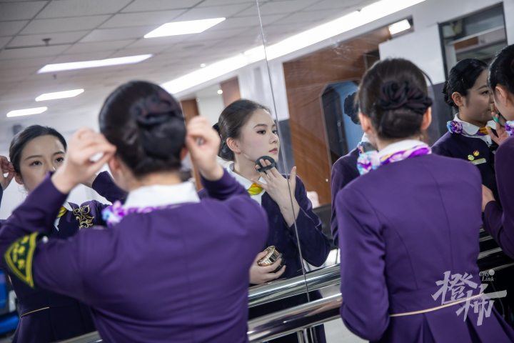 杭州客运段杭东乘务基地,出乘进站前,“西子号”乘务组列车员们进行仪容整理。