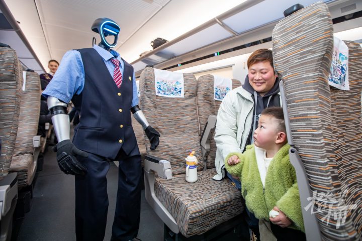 今年春运,“西子号”还迎来了一位特殊的“编外乘务员”——智能服务机器人“福兴”。它身着铁路制服,一亮相就吸引了全车厢的目光。