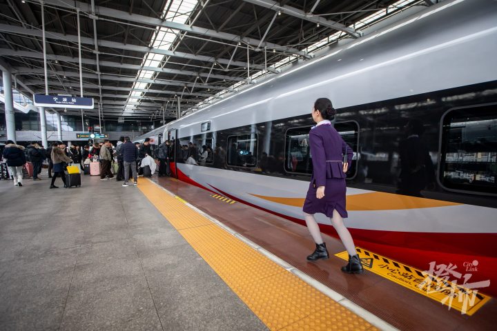 昨天中午,从南京南站开来的G7511次“西子号”列车抵达杭州东站,钱佳和其他7位列车员,引导旅客有序下车和上车。停留3分钟后,列车继续驶向温州。